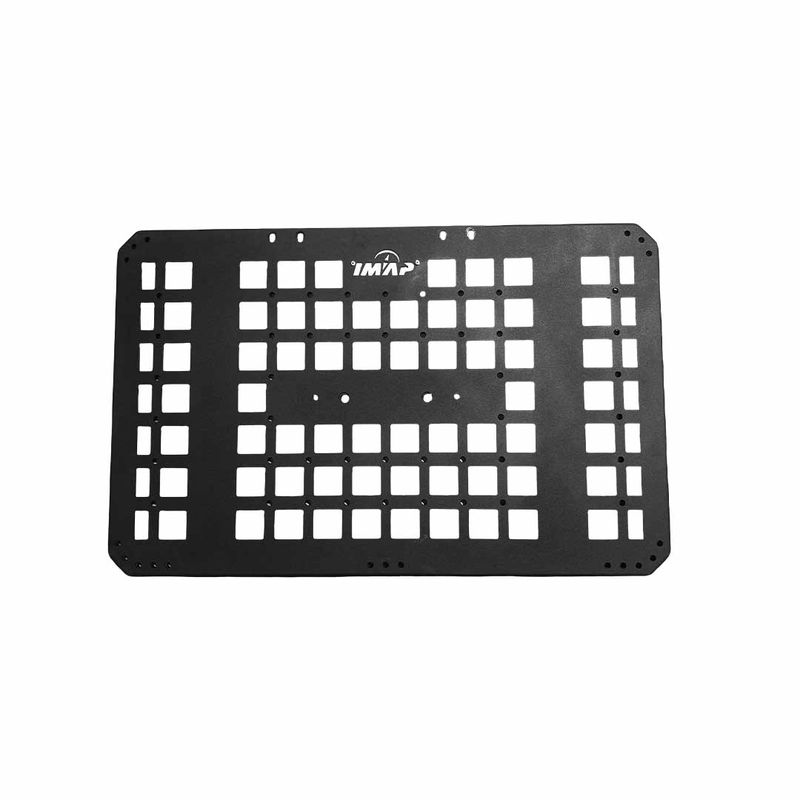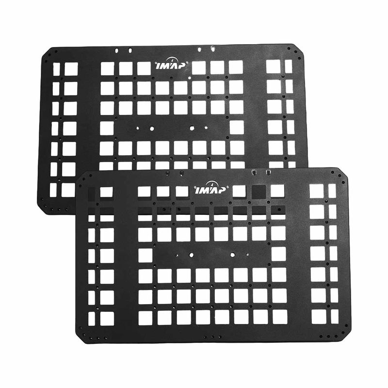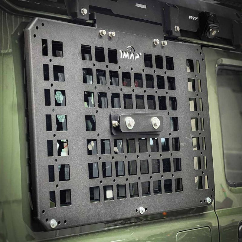 Panel Molle exterior compatible con Suzuki Jimny versión de 3 puertas, ideal para organizar y fijar accesorios en el exterior del vehículo.Lamina de acero al crabon de 1/8”y pintura negro mico mate con pernos de acerados.peso que soporta 25 LBS .medidas 80CMSX50CMS