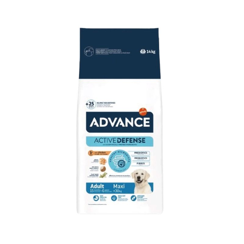 Advance Adult Maxi es un alimento de alta gama fácil de digerir formulado para cubrir las necesidades de los perros adultos de tamaño grande. Está elaborado con pollo como primer ingrediente. Ayuda a mantener la masa muscular gracias a su nivel de proteina de alta calidad y contribuye a una piel saludable y un pelo brillante gracias a los ácidos grasos omega 6 y 3.