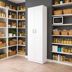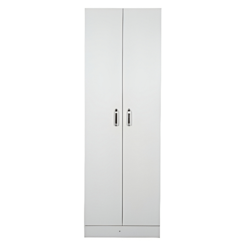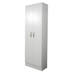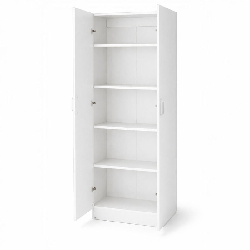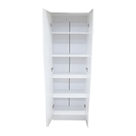 Alacena multiusos para cocina, almacenes, entornos formales, oficinas, habitacines, etc. Fabricada con melamina completamente color blanco, con dos puertas abatibles y manijas metálicas; cuenta con amplio espacio para almacenamiento y cuatro entrepaños ideales para guardar alimentos, utensilios o electrodomésticos. El producto se entrega completamente ensamblado.
