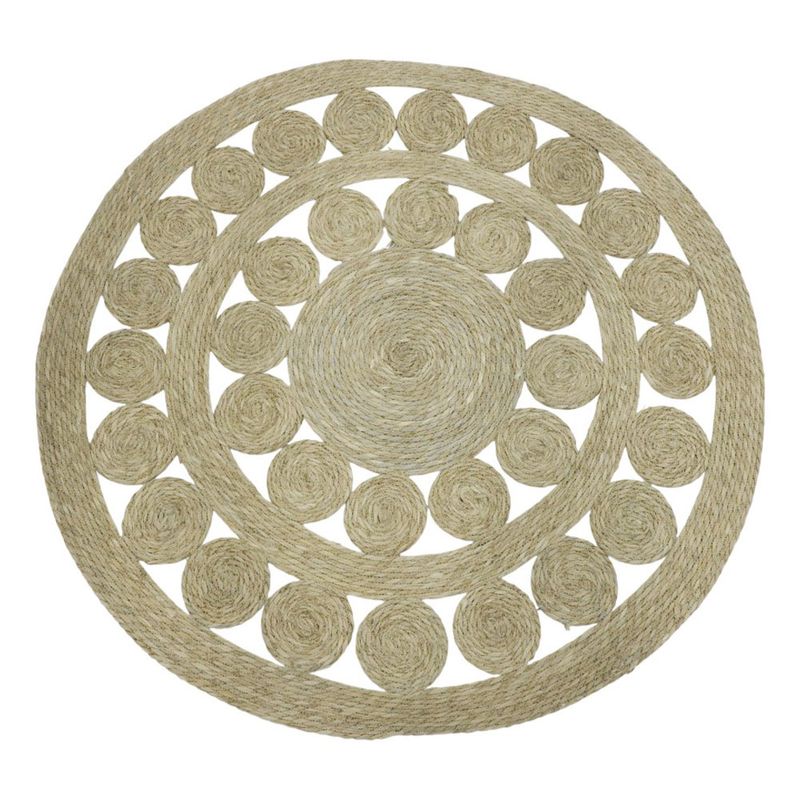 Alfombra redonda elaborada en fibra natural trenzada con diseño tipo sol, adecuada para salas, comedores o entradas. Su material aporta resistencia al desgaste y una superficie firme y estable. Para conservarla en buen estado se recomienda evitar humedad prolongada, sacudirla regularmente y limpiar con paño seco o cepillo suave para retirar polvo.