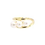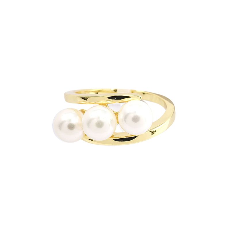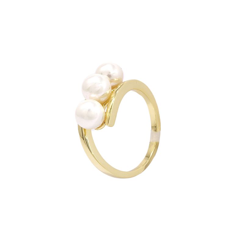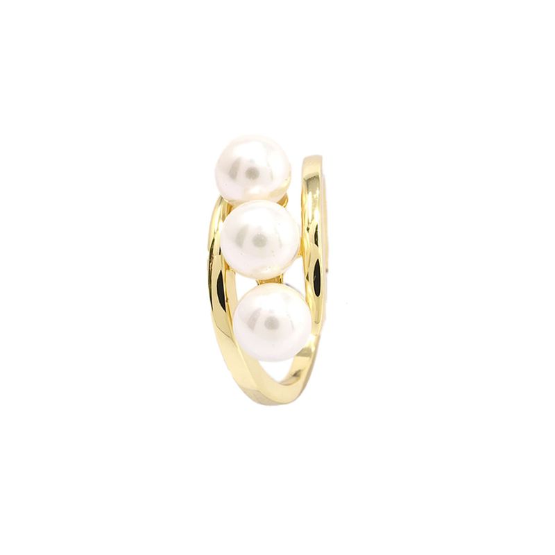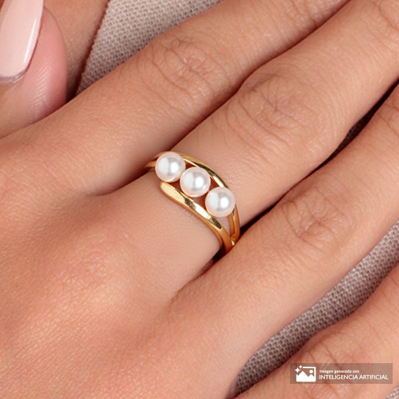 Un anillo de brass con baño de oro que combina un diseño moderno con el encanto atemporal de las perlas. Su estructura delicada y el brillo suave del acabado dorado crean un contraste atractivo, ideal para quienes buscan una pieza con personalidad y presencia sutil.