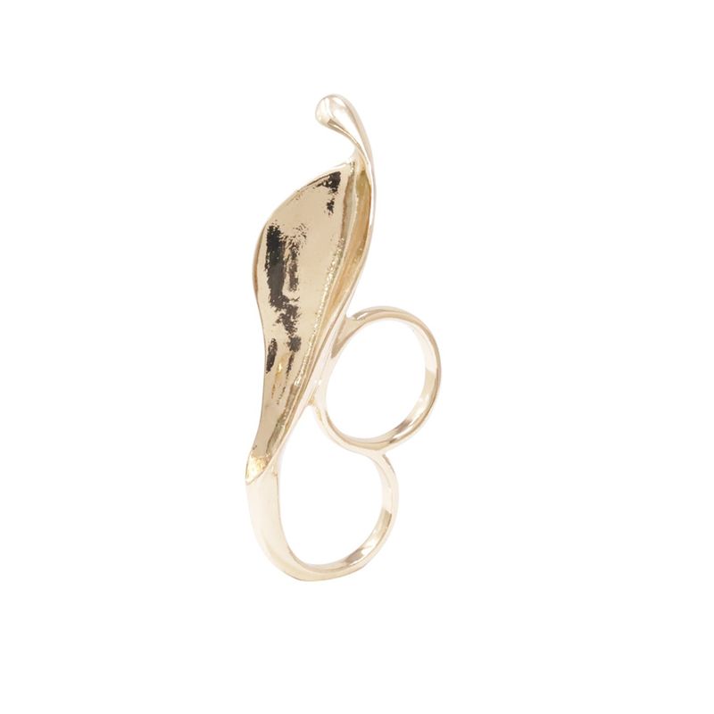 Este anillo doble bañado en oro destaca por su diseño artístico inspirado en la naturaleza. Su forma alargada y curva imita una hoja en movimiento, aportando un toque elegante y moderno a cualquier look. Elaborado con acabado brillante, combina arte y estilo contemporáneo, ideal para quienes buscan un accesorio único que refleje personalidad y sofisticación.