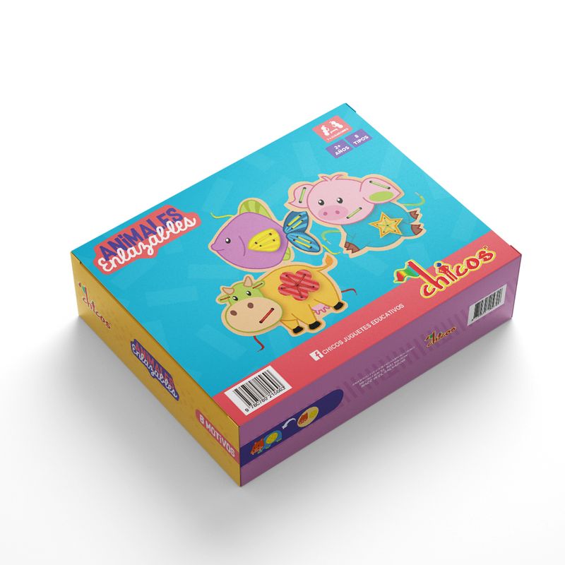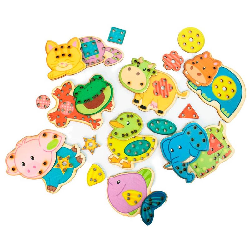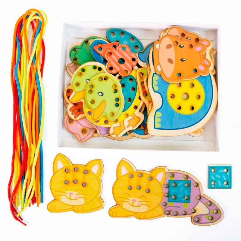 Esta colección de figuras con agujeros permite a los niños practicar la acción de enlazar, desarrollando la coordinación ojo-mano, la motricidad fina y el conocimiento de figuras, animales y colores.