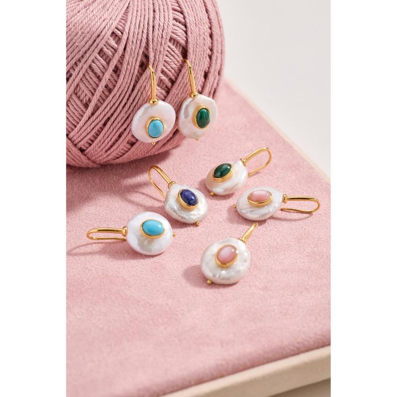Aretes Perlas Naturales forma Botón Con piedras naturales al centro : Malaquita, Lapis lazuli, Turquesa y Concha nácar rosada.