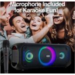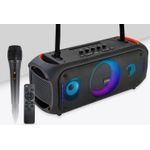 Su sistema de iluminación multicolor sincronizada con el ritmo transforma cada canción en un espectáculo visual, mientras que las entradas duales de micrófono lo convierten en la opción perfecta para sesiones de karaoke. Gracias a su batería de larga duración, portabilidad y múltiples opciones de conectividad, el Rave 75 Premium es el aliado perfecto para animar cualquier ocasión, en interiores o exteriores.