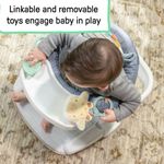 El inserto del asiento es removible y se transforma en un tapete para tummy time, que incluye texturas crujientes, dos juguetes (jirafa y hoja) y 3 etiquetas coloridas para estimular los sentidos y mantener al bebé entretenido. La bandeja desmontable incorpora 2 juguetes enlazables, ideales para el juego tanto en casa como fuera de ella.