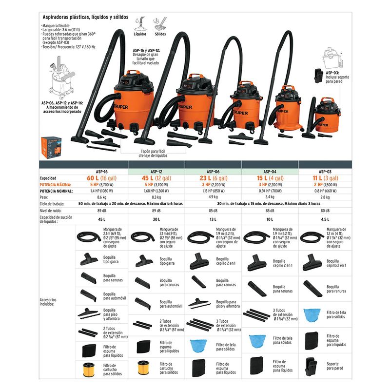 Potente aspiradora industrial equipada con un motor de 2 HP, ideal para aspirar tanto líquidos como sólidos en diversas superficies. Con un tanque de 3 galones (11 litros) de capacidad, esta aspiradora es perfecta para trabajos que requieren potencia y eficiencia.