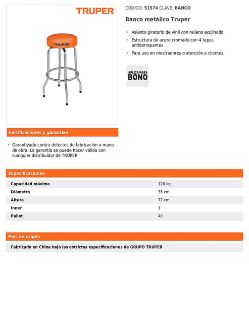 Banco metálico diseñado con estructura de acero cromado y asiento giratorio de vinil con relleno acojinado. Cuenta con cuatro tapas antiderrapantes que brindan estabilidad durante su uso. Es ideal para mostradores o áreas de atención al cliente gracias a su altura y comodidad.