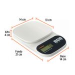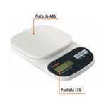 Báscula digital para cocina de 5 kg con cuerpo y plato de ABS. Incluye función TARA, pantalla LCD de lectura fácil, indicador de sobrepeso y batería baja, apagado automático, diseño compacto y ligero. Usa 2 pilas AAA incluidas y cumple con la norma NOM-010-SCFI.