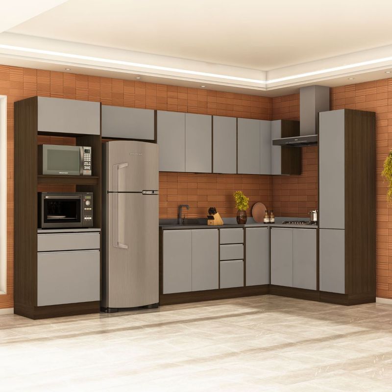 Su diseño contemporáneo combina puertas en color gris mate con laterales en color castaño, ideal para cualquier estilo de decoración.