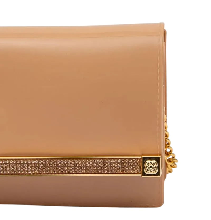 Bolso pequeño, estructurado con cierre magnético. Este modelo ofrece un estilo extra a su look, debido a su forma, detalles en cadena en la correa, y placa frontal con detalles en dorado y brillo. ¡Apuesta por este modelo para impactar con tus looks!