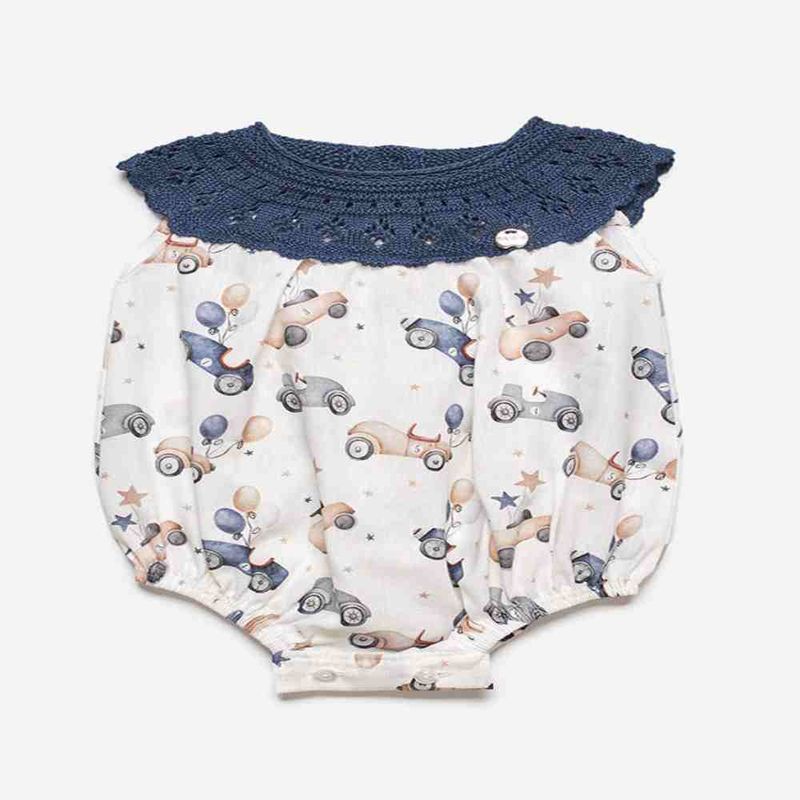 Mameluco para bebé niño, con cierre de broches en la parte inferior para facilitar el cambio de pañal. El cuello es de punto veraniego y tiene un diseño de cuello redondo, lo que lo convierte en un mono muy elegante, sin mangas y con estampado de coches y estrellas.