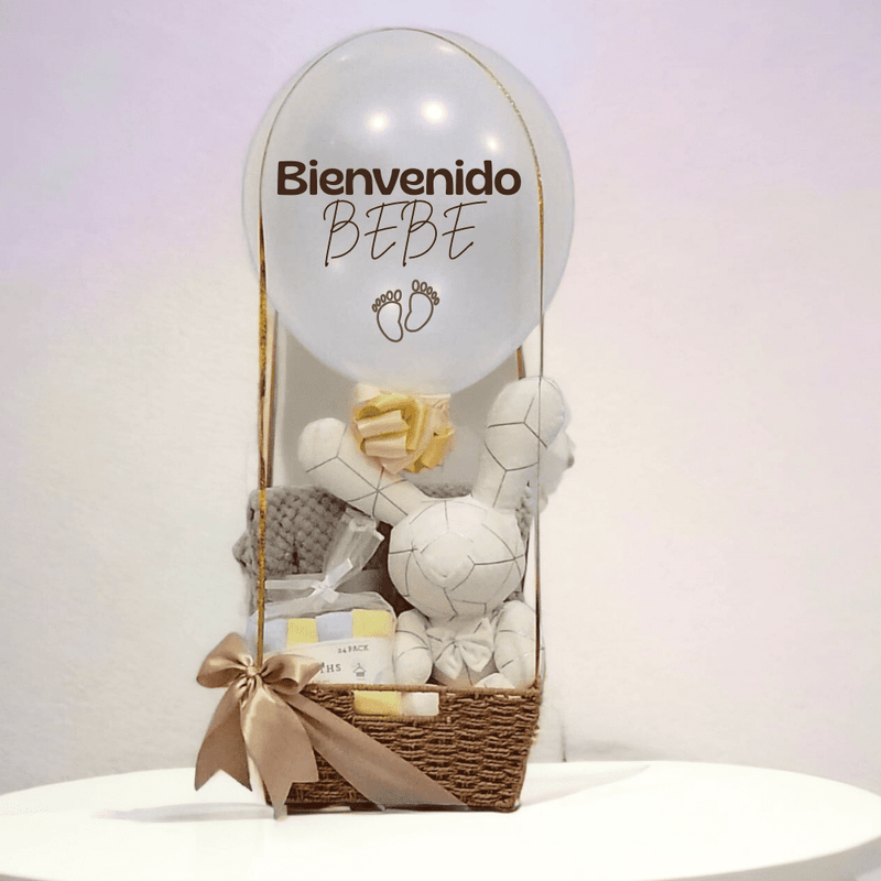Peluche según disponibilidad, Pak de toallas faciales de bebe, cobija. En cesta decorada con listón y tarjeta. Incluye vejiga personalizada.
