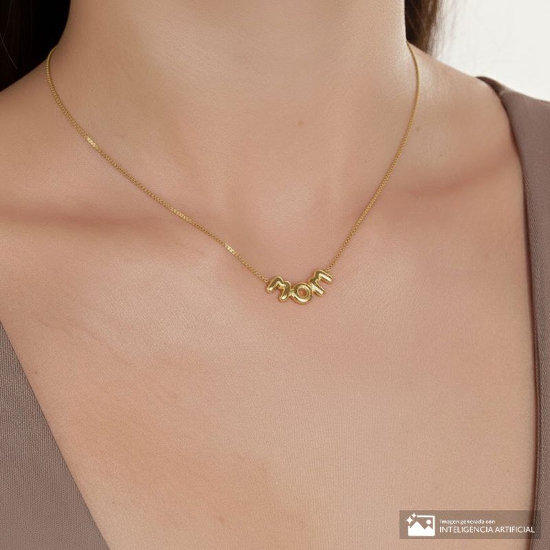 Este collar dorado incorpora un dije con la palabra “MOM” en letras redondeadas de acabado brillante, creando una pieza emotiva y perfecta para regalar; su cadena fina ofrece un look delicado, mientras que el cierre de mosquetón con extensión permite ajustar el largo para adaptarlo a distintos estilos, convirtiéndolo en un detalle ideal para celebrar a mamá.