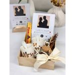 Caja de madera con cuadro acrílico, tazas y chocolate