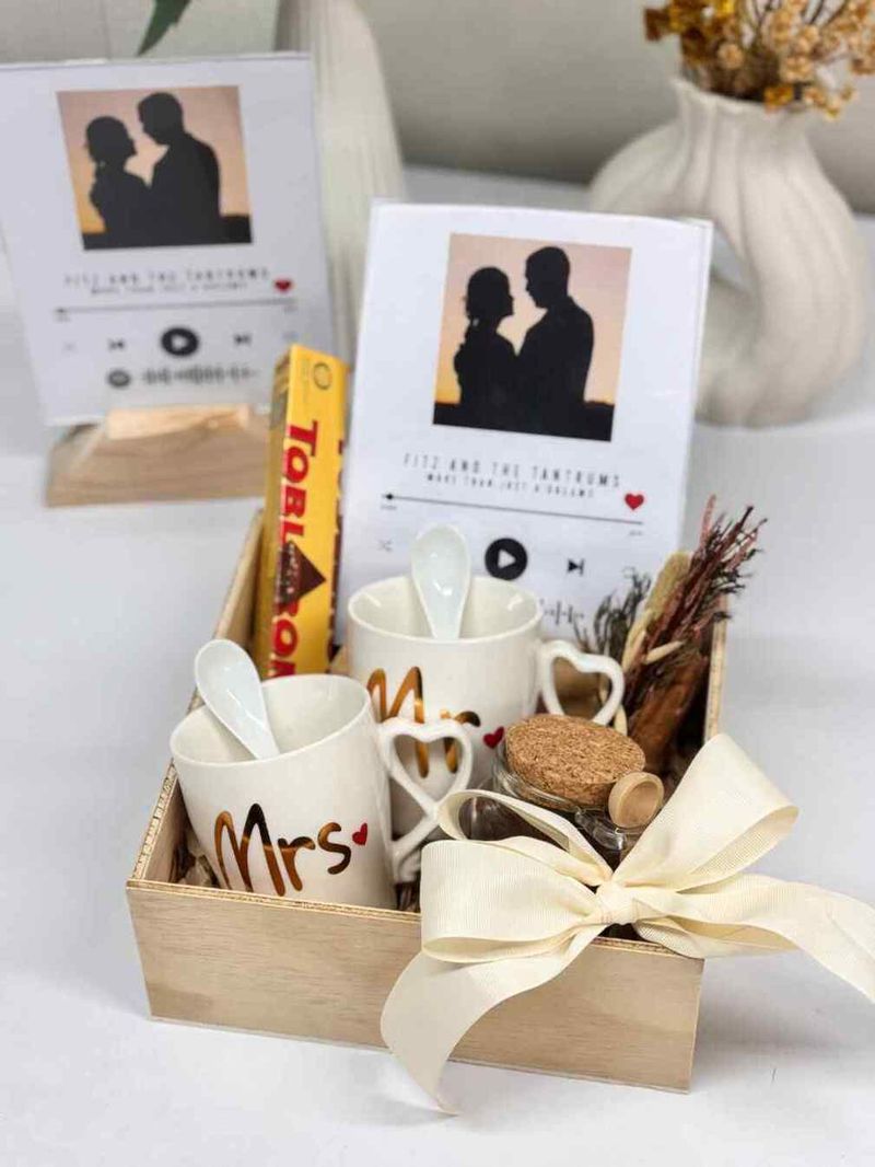 Cuadro acrílico diseño personalizado, base de madera, Chocolate toblerone, jar de café, pin de canela2 tazas de Mr. y Mrs. Caja de madera decorada con listón Y tarjeta.Gratis personalizado en cuadro acrílico.