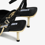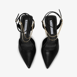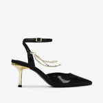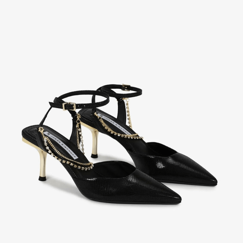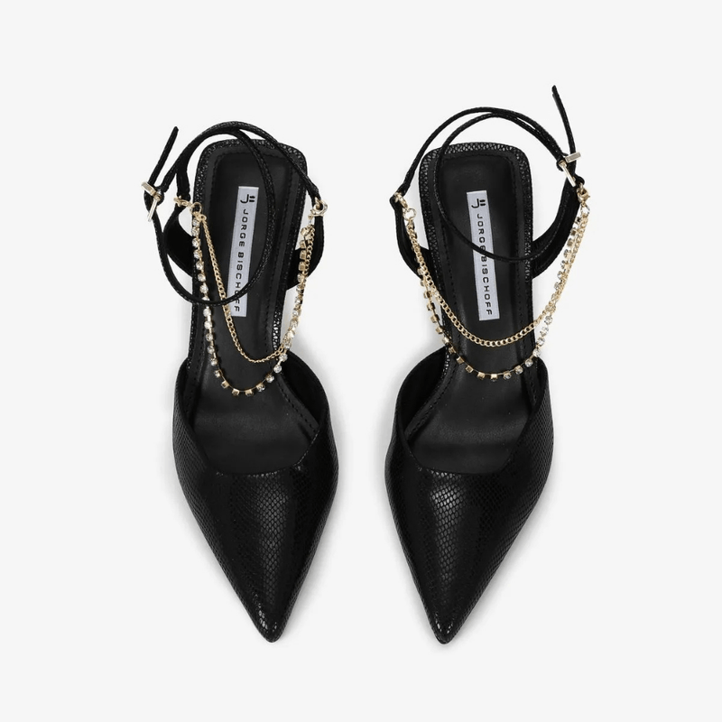 Lo más destacado es el doble colgante y las cadenas de la tira de cierre, un detalle moderno y versátil que se puede quitar, lo que permite crear looks más discretos o atrevidos según la ocasión.Versátil y con mucha personalidad, este zapato destalonado negro es perfecto para looks elegantes de fiesta, eventos, trabajo o incluso para añadir un toque refinado a un look | Material: Cuero genuino Italiano | Cierre: hebilla | Plantilla: cuero mini snake suave | Tipo de tacón: geométrico | Categoria: Calzado para dama | Altura del tacón (cm): 7.5 | Suela: PU | Marca: Jorge Bischoff