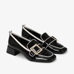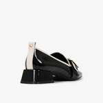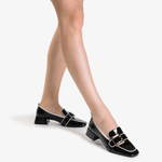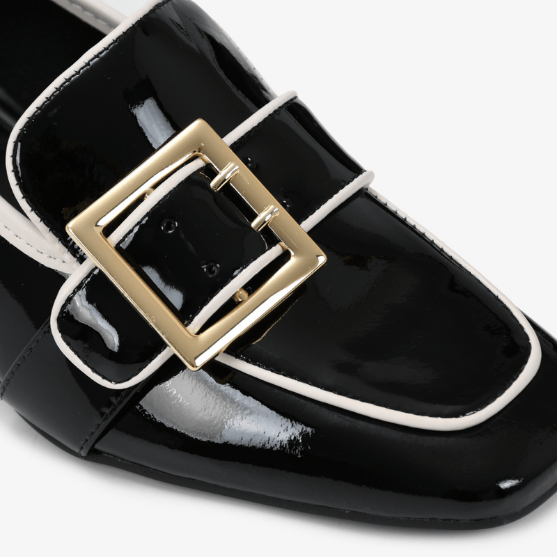 Mocasin negro, un acabado elegante que aporta un toque futurista y elegante. Mocasin con punta cuadrada, una silueta contemporánea y de gran presencia.