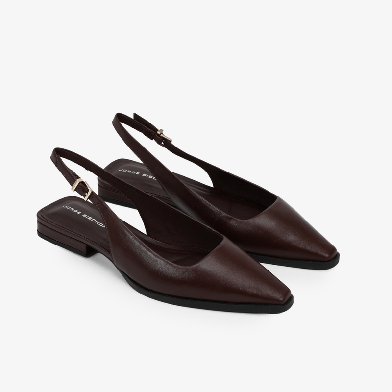 La elegancia minimalista en su máxima expresión: slingbacks café oscuro de Jorge Bischoff, un básico refinado que eleva cualquier look. Perfectas para un look ejecutivo, con pantalón de vestir beige, camel o negro. | Material: cuero suave | Cierre: hebilla | Plantilla: cuero verniz | Tipo de tacón: geométrico | Categoria: Calzado para dama | Altura del tacón (cm): 3.5 cm | Suela: PU | Marca: Jorge Bischoff
