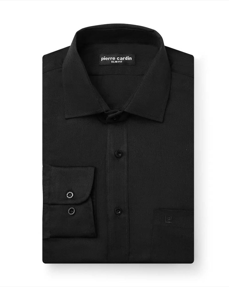 Camisa formal de la marca Pierre Cardin. Diseñada con textura en color negro, cuello inglés, mangas largas con botones ajustables, y cierre central de botones.
