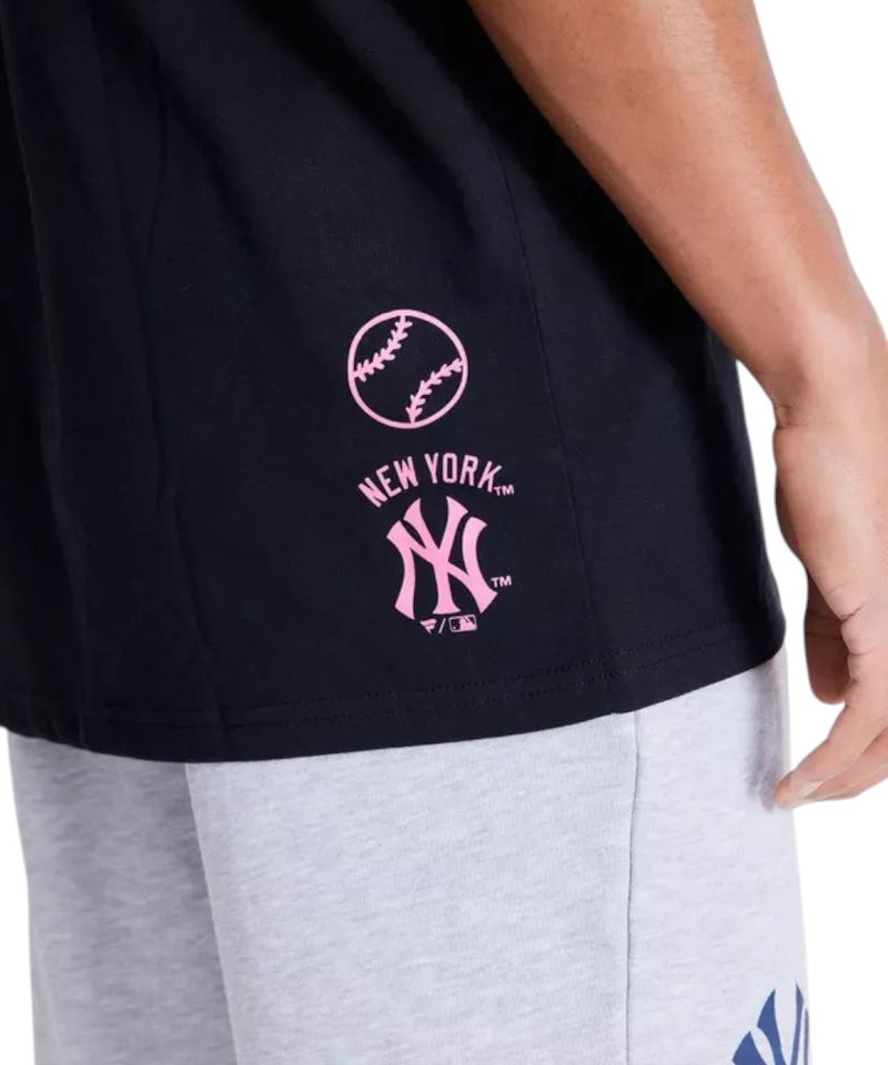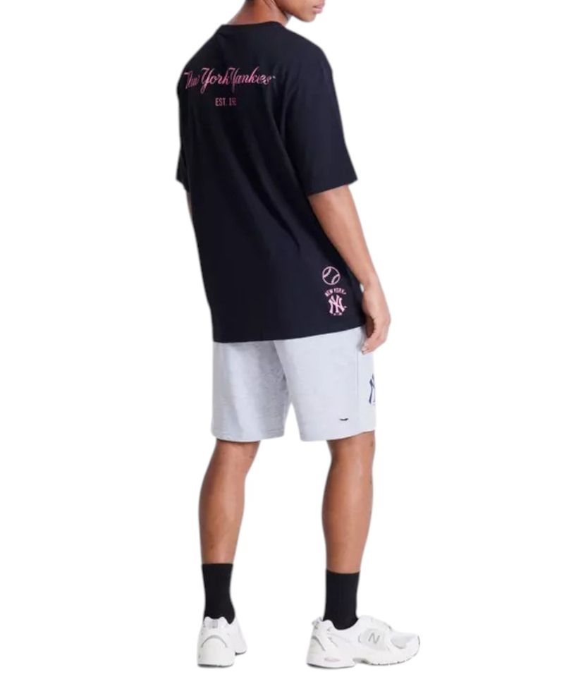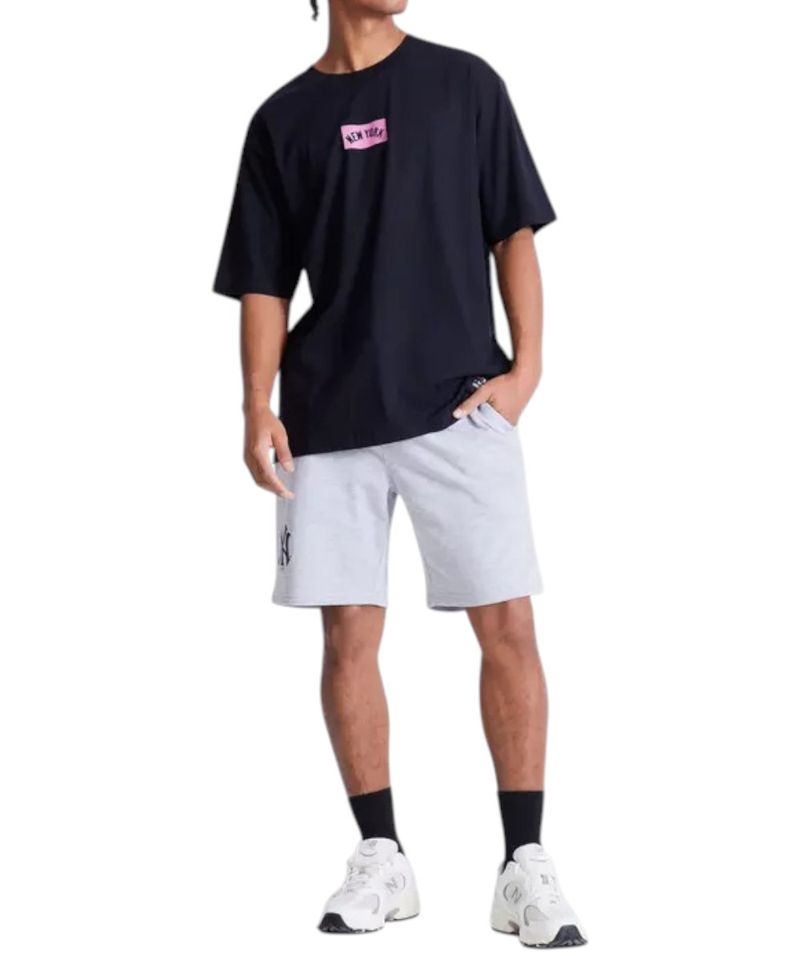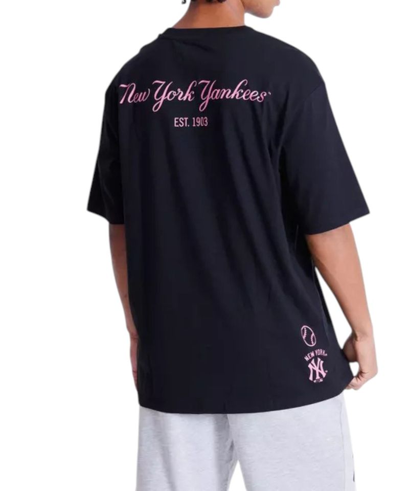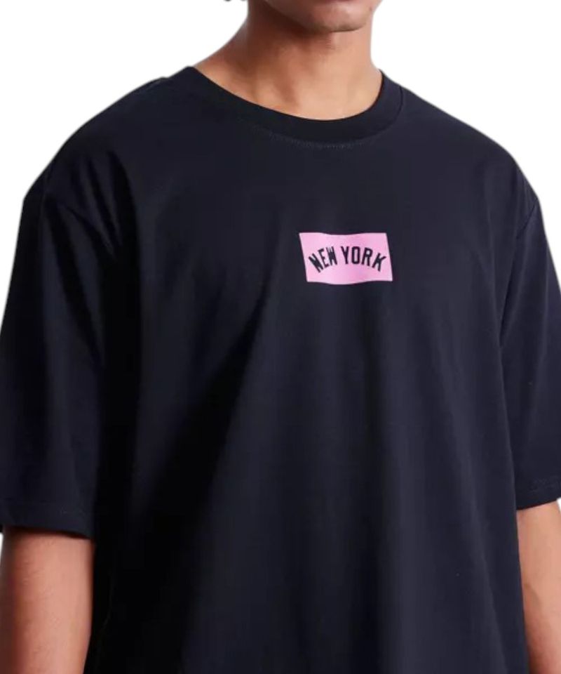 Camiseta deportiva diseñada en color negro con estampado frontal “New York” en recuadro rosa, cuello redondo y corte oversize con mangas amplias.