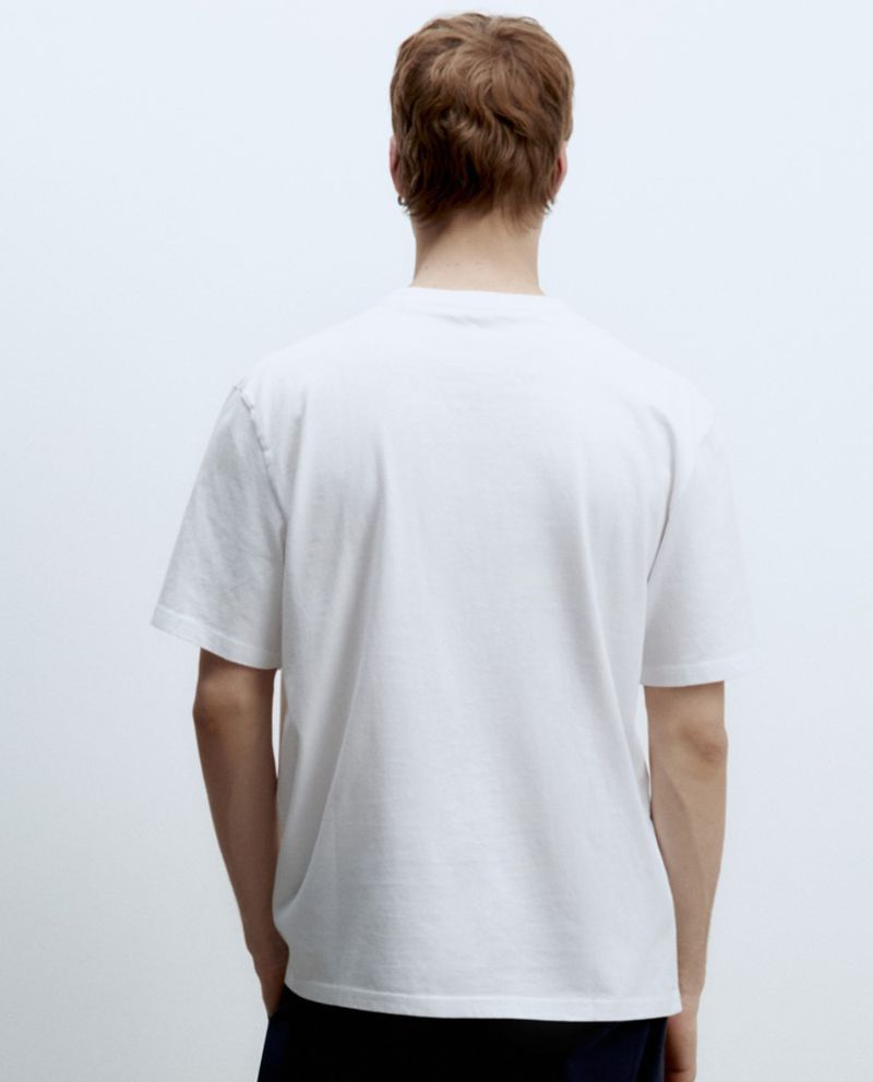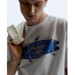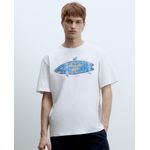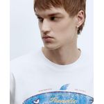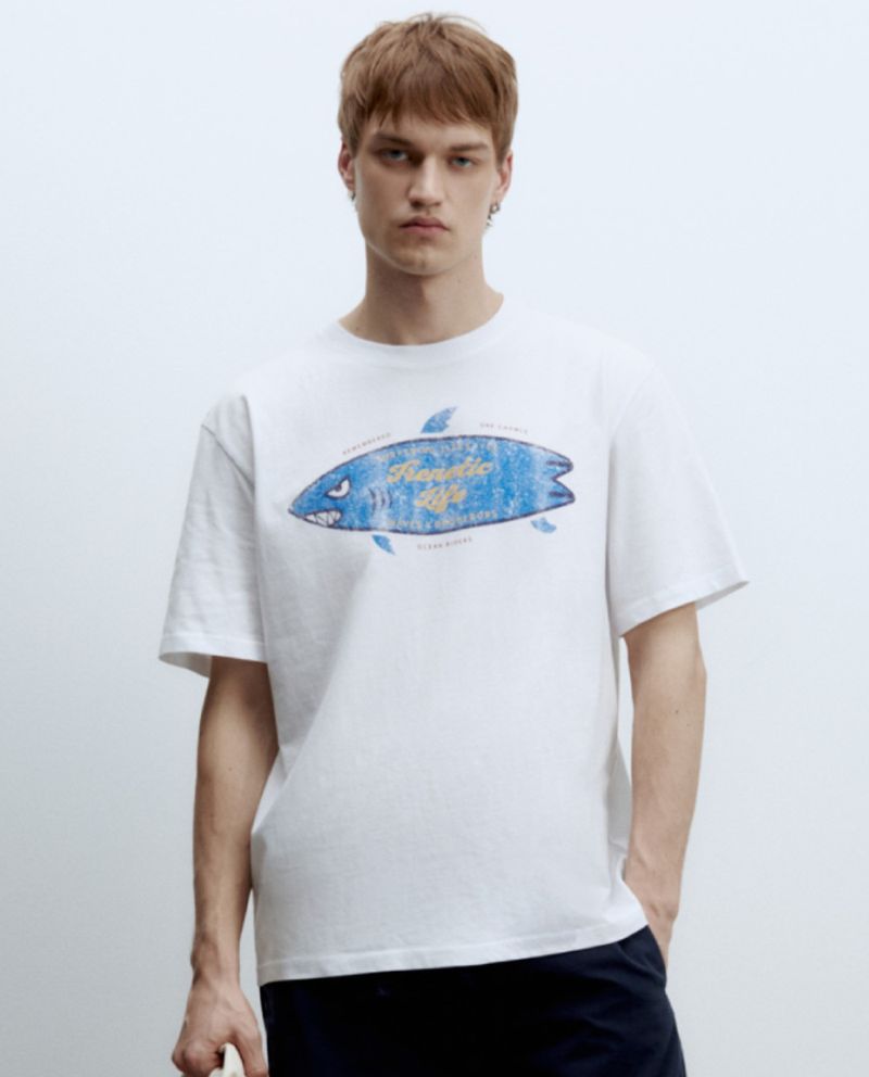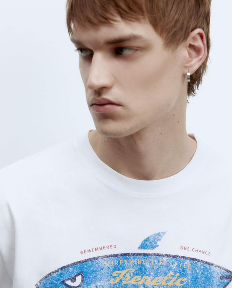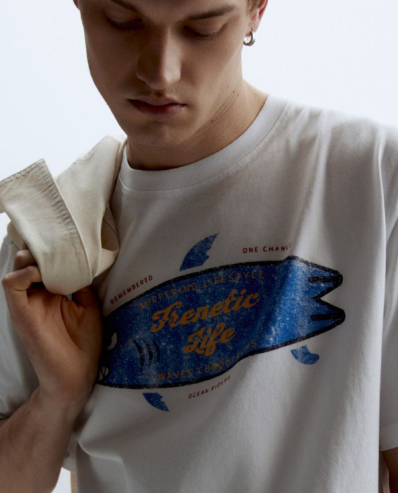 Camiseta casual marca Sfera, diseñada en color blanco con estampado de tiburón y texto "Frenetic Life", cuello redondo y mangas cortas.