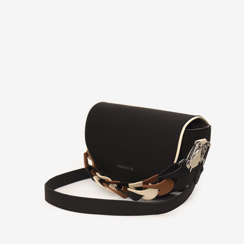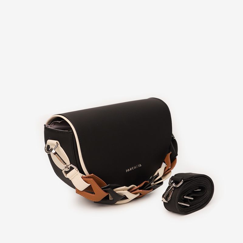 Una estructura mediana y compacta con tapa dura y cierre magnético para mayor seguridad, asa de eslabones con colores que contrastan y correa larga ajustable. Es una cartera versátil, perfecta para completar tus outfits para cada ocasión.