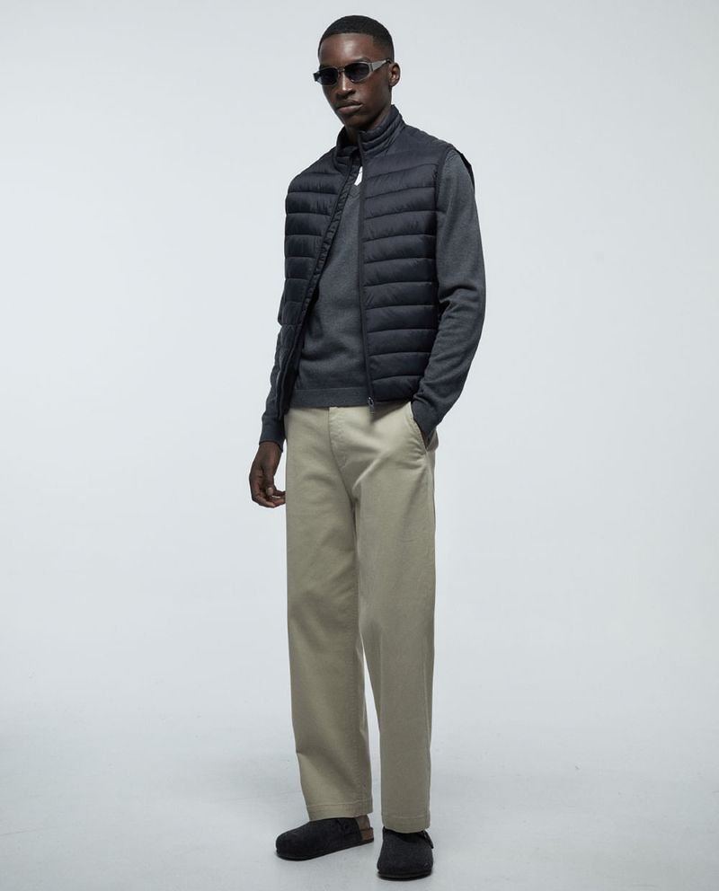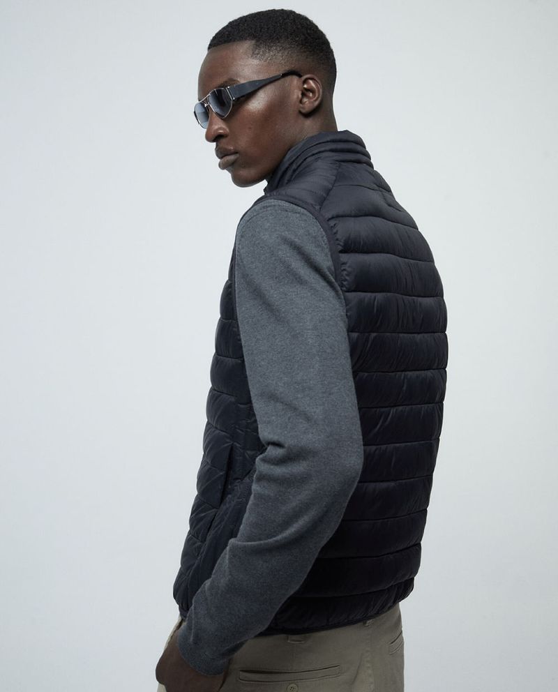 Chaleco casual acolchado de la marca Sfera, con diseño sólido en color negro, y cuello alto con cierre central de cremallera.