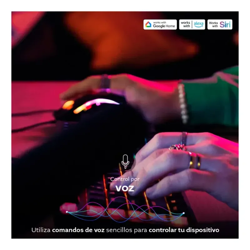 - Control por voz inteligente: enciende, apaga, cambia escenas o regula la intensidad usando comandos de voz con Alexa, Siri o Google Assistant.
