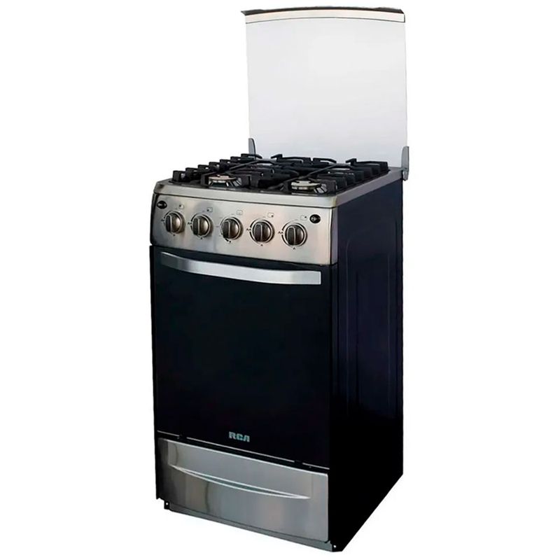 Con respaldo de cristal templado gris y cubierta de Acero Inoxidable. Cuenta con 2 parrillas de hierro fundido y 4 quemadores: 4 Estándar. Con perillas ergonómicas Push & Turn, y panel Top Control. Además, el horno cuenta con una parrilla sencilla, para su fácil limpieza y puerta panorámica acabado con Door Stop System para un cerrado suave.