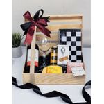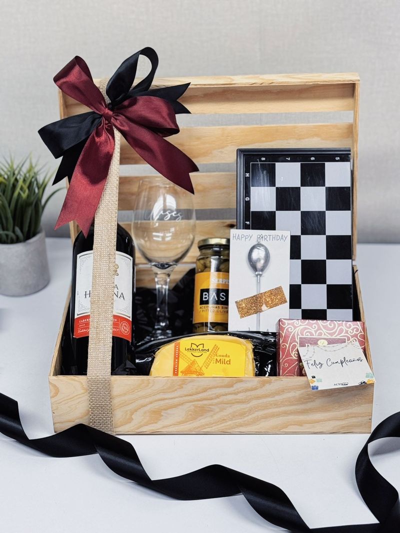 botella de 750ml vino chileno, Copa de cristal, Juego de ajedrez, Aceitunas, queso, chocolates y vela en tag con mensaje.