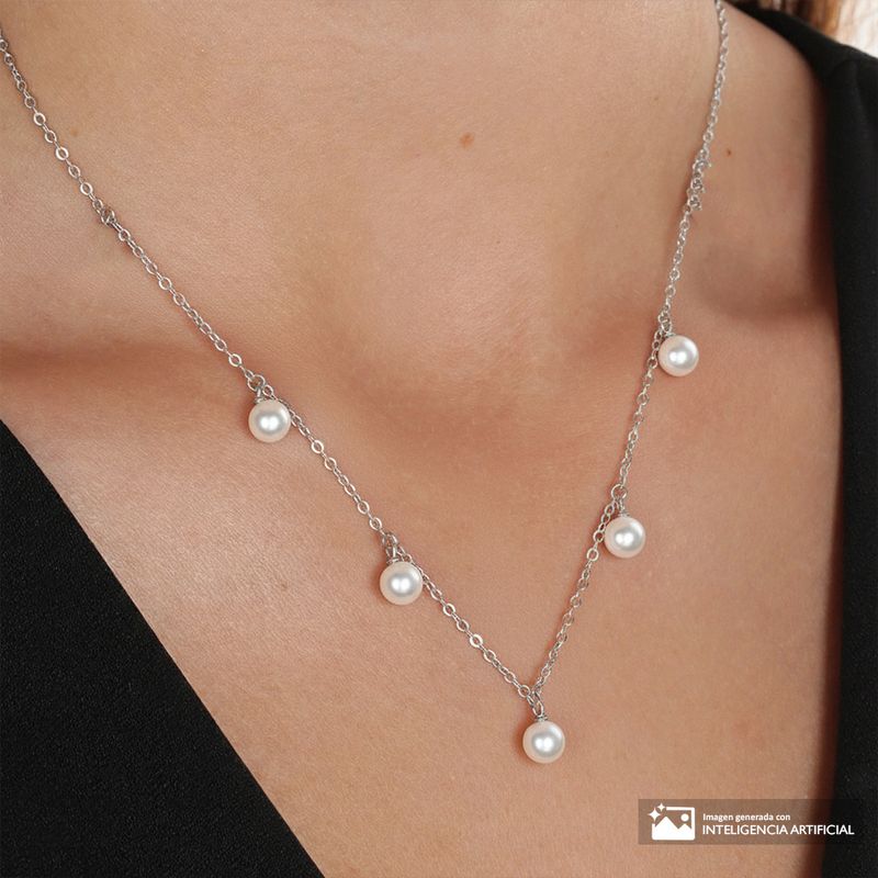 Este collar de brass con baño de oro incorpora varias perlas sintéticas distribuidas a lo largo de la cadena, creando un diseño delicado con un toque distintivo. Su acabado brillante y su estructura ligera lo convierten en una pieza versátil, ideal para complementar looks diarios o dar un toque especial a un conjunto más cuidado.
