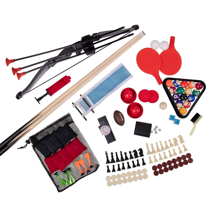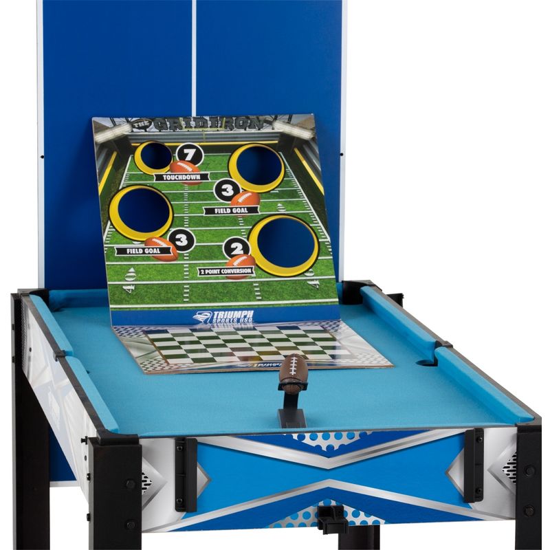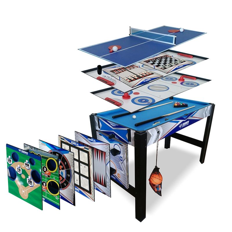 Esta mesa 13 en 1 ofrece el mejor valor con más juegos por su dinero y más juegos en menos espacio. La mesa Triumph 13 en 1 Multi Game, tiene 13 juegos diferentes para elegir, desde juegos de acción como baloncesto y tiro con arco hasta juegos desafiantes para la mente como el ajedrez o las damas. Cambia de un juego a otro en minutos., incluye todos los accesorios necesarios para jugar cada juego. Después de jugar, los tableros de juego se guardan convenientemente en el sistema de almacenamiento incorporado cuando no están en uso. También se incluye una bolsa de almacenamiento para todas las piezas y accesorios de juegos pequeños. Los 13 juegos incluidos son billar, push hockey, tenis de mesa, baloncesto, lanzamiento de fútbol, lanzamiento de béisbol, lanzamiento de bolsas de frijoles de tres en raya, lanzamiento de bolsas de frijoles Skee, dardos de punta blanda, ajedrez, damas, backgammon y tiro con arco.