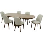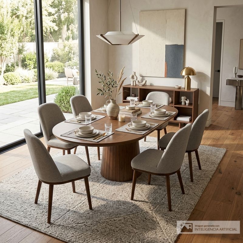 • Diseño contemporáneo y orgánico: Este comedor destaca por su mesa de forma ovalada con bordes suaves, creando un ambiente moderno, fluido y elegante que se adapta perfectamente a espacios amplios y sofisticados.
