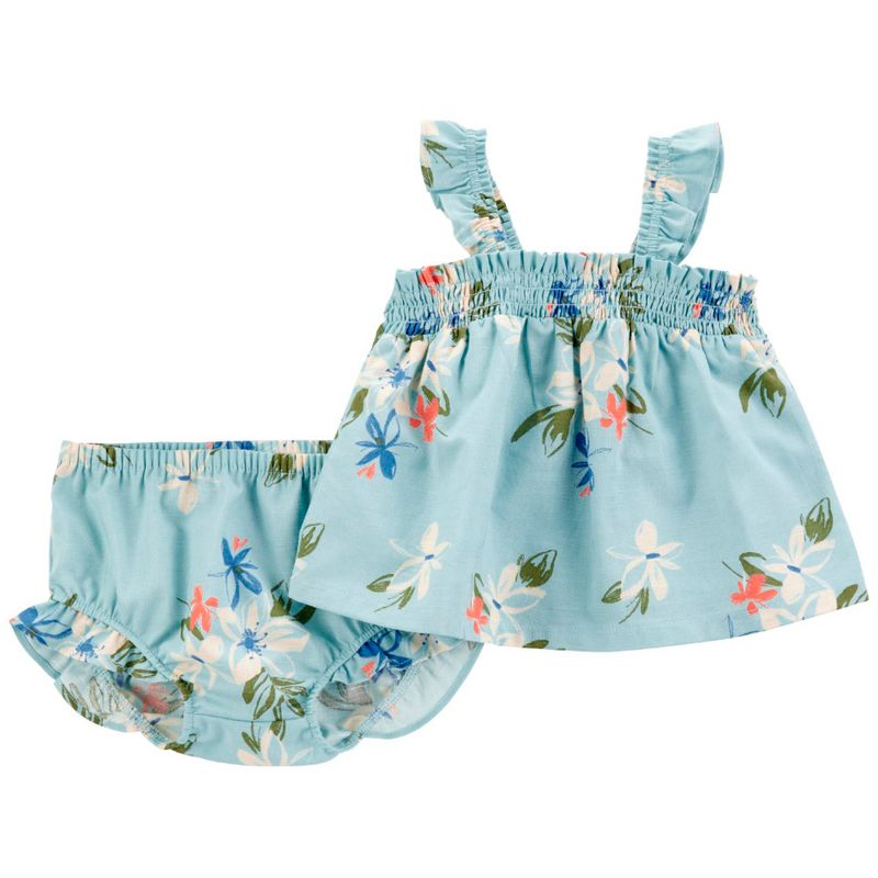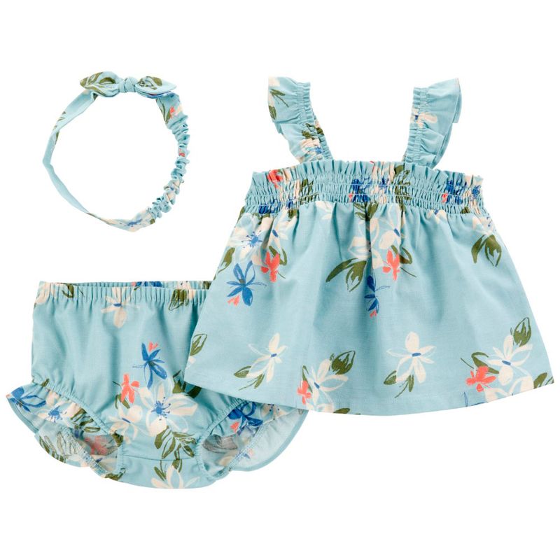 Encantador conjunto de 3 piezas para bebé niña, ideal para lucir fresca y cómoda. Incluye un vestidito con tirantes anchos y detalles de elástico fruncido en el pecho, confeccionado en suave tela color celeste con estampado floral multicolor. Se complementa con un bloomer a juego, con volantes en las piernas y cintura elástica para mayor comodidad. Incluye una diadema elástica con moño decorativo que aporta un toque adorable al look. Perfecto para días soleados o sesiones de fotos.