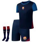 La camiseta destaca por su diseño en tonos azul marino y azul rey, con detalles en granate y el escudo del Barça en el pecho, aportando un look auténtico y deportivo. El short, también en azul marino con acentos granate y el escudo del club, cuenta con cintura elástica que se ajusta cómodamente al cuerpo. Las calcetas, en azul y rojo característicos del equipo, completan el conjunto con estilo y personalidad.