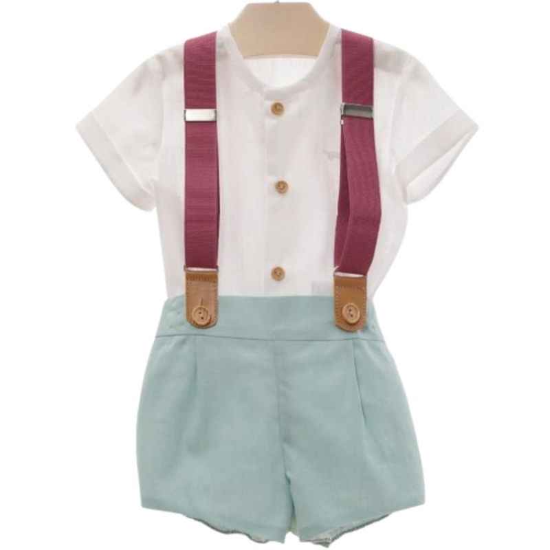 Este encantador conjunto de 3 piezas para bebé niño es perfecto para ocasiones especiales o para lucir con estilo en cualquier momento. Incluye una camisa blanca de manga corta con botones frontales de madera que le aportan un toque clásico y elegante. Se complementa con un short verde menta de corte alto que brinda comodidad y frescura. Los tirantes elásticos en color vino con detalles en piel sintética añaden un aire moderno y encantador al conjunto. Una opción adorable y práctica para los primeros eventos importantes del pequeño.