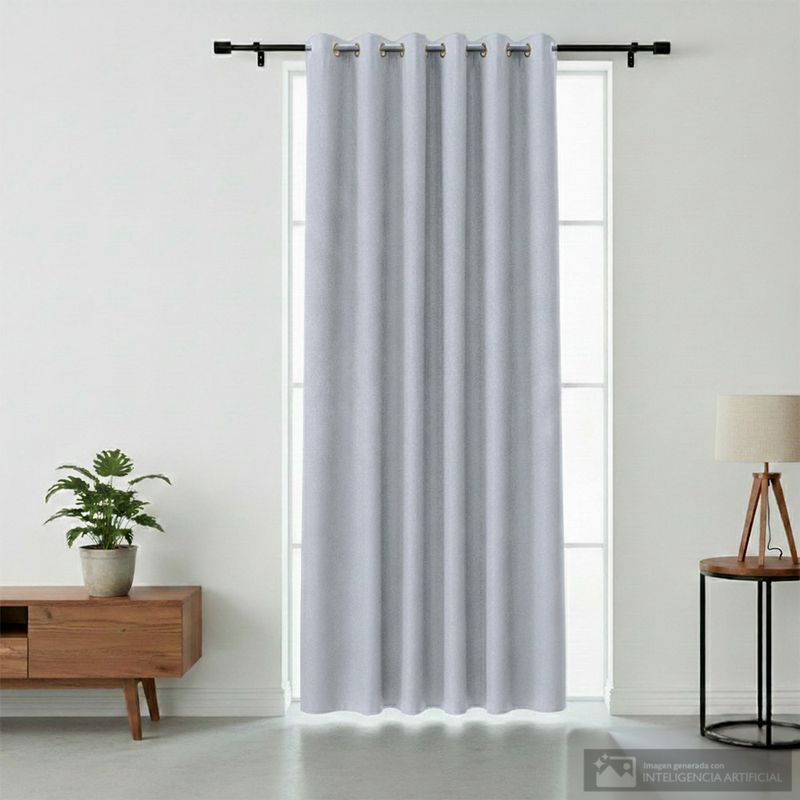 Cortina blackout con textura jacquard fabricada en poliéster. Su material opaco ayuda a bloquear la luz y ofrece privacidad. Los ojales metálicos facilitan su colocación en barras estándar.