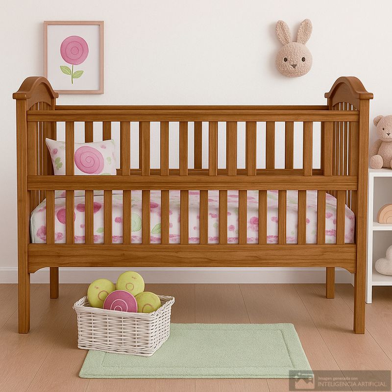 Cuna elaborada en madera de laurel, cuenta con 2 niveles de altura que se adaptan al crecimiento de tu bebé, con esquinas redondeadas para mayor seguridad. (Imagen con fin ilustrativo- no incluye accesorios)