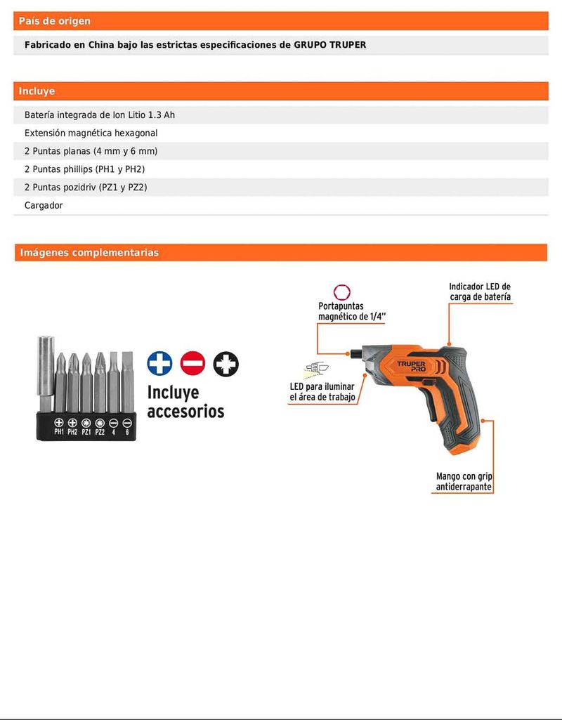 Destornillador inalámbrico diseñado para trabajos de atornillado en aplicaciones domésticas y de mantenimiento ligero. Cuenta con porta puntas magnético hexagonal de 1/4 in, luz LED para iluminar el área de trabajo, bloqueo de seguridad y mango con grip antiderrapante que facilita un manejo cómodo y seguro durante su uso.