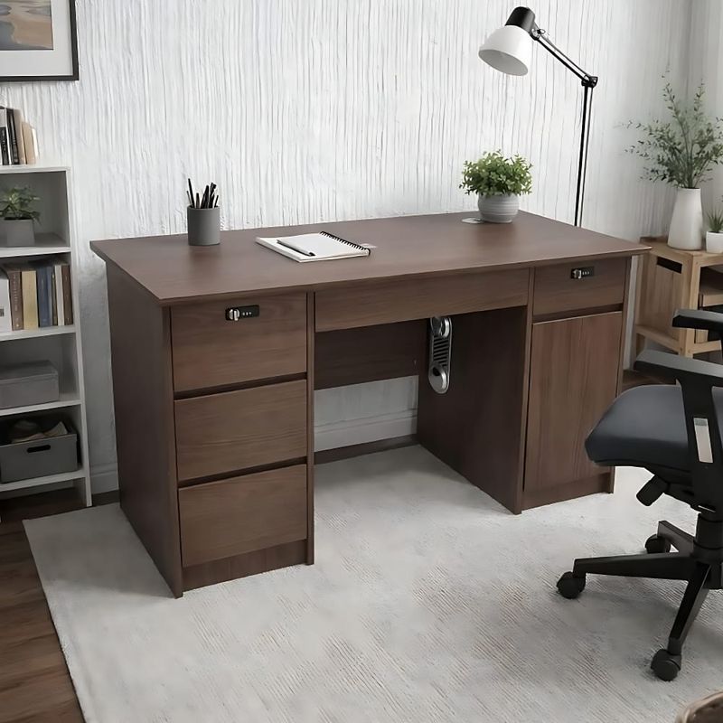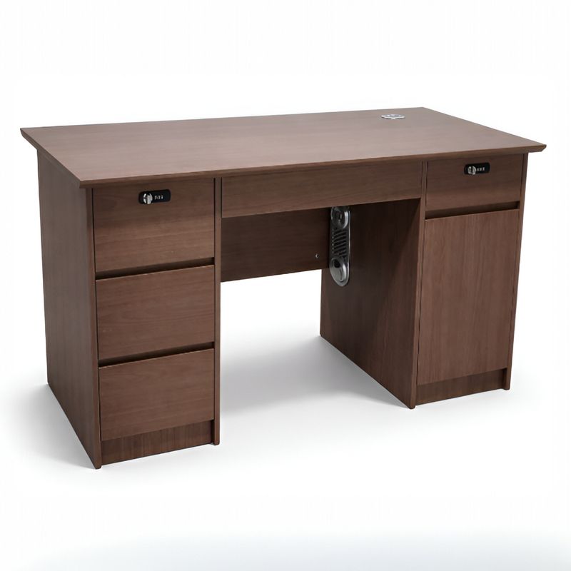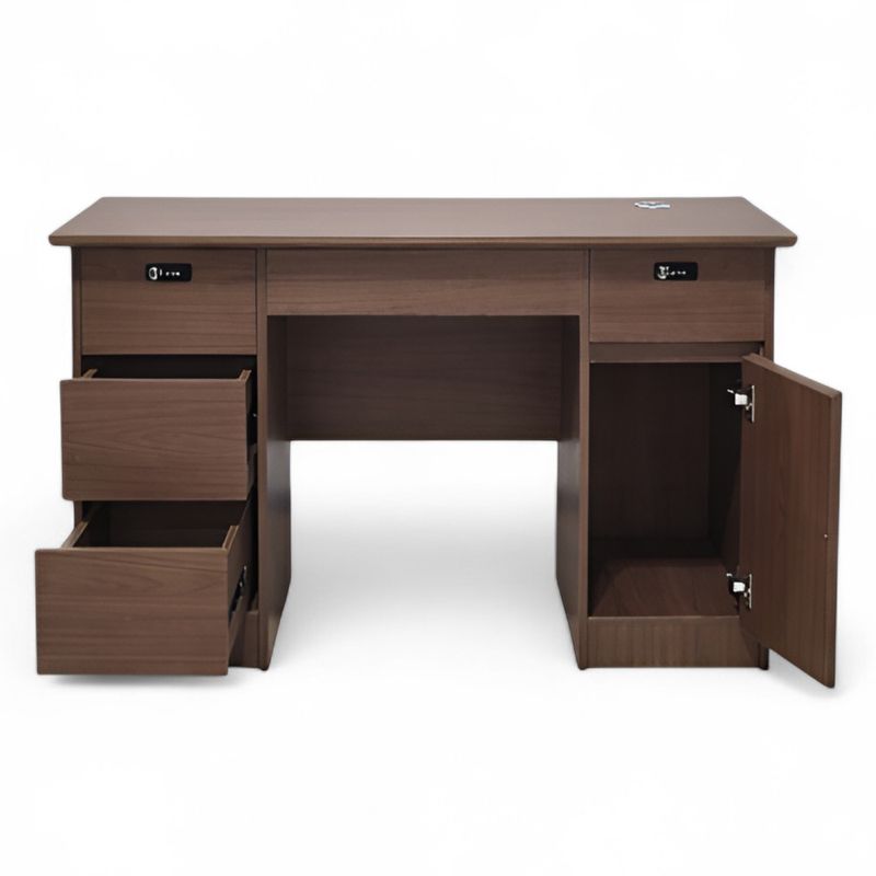 Este escritorio ejecutivo está elaborado en melamina de alta resistencia. Cuenta con cuatro gavetas laterales con rieles telescópicos y una gaveta tipo lapicera, apertura suave y silenciosa, ideal para documentos, artículos de oficina o dispositivos personales. Cerraduras digitales por combinación integradas en las gavetas y cajón principal, eliminando el uso de llave física y brindando mayor seguridad y control de acceso. Puerta abatible inferior con bisagras metálicas reforzadas y un pasacable con ranuras para ventilación, perfecta para almacenar CPU, folders o equipos. Incluye pasacable redondo en la parte superior derecha del tablero del escritorio. Mueble importado , se entrega completamente ensamblado, ideal para oficinas, home office, librerias, recepciones, etc.