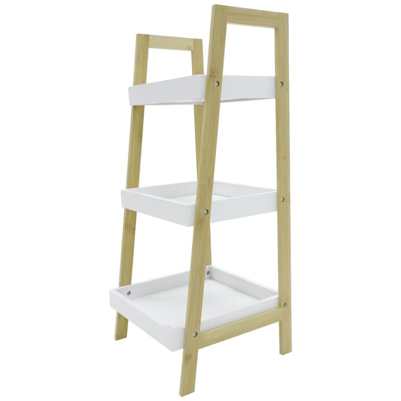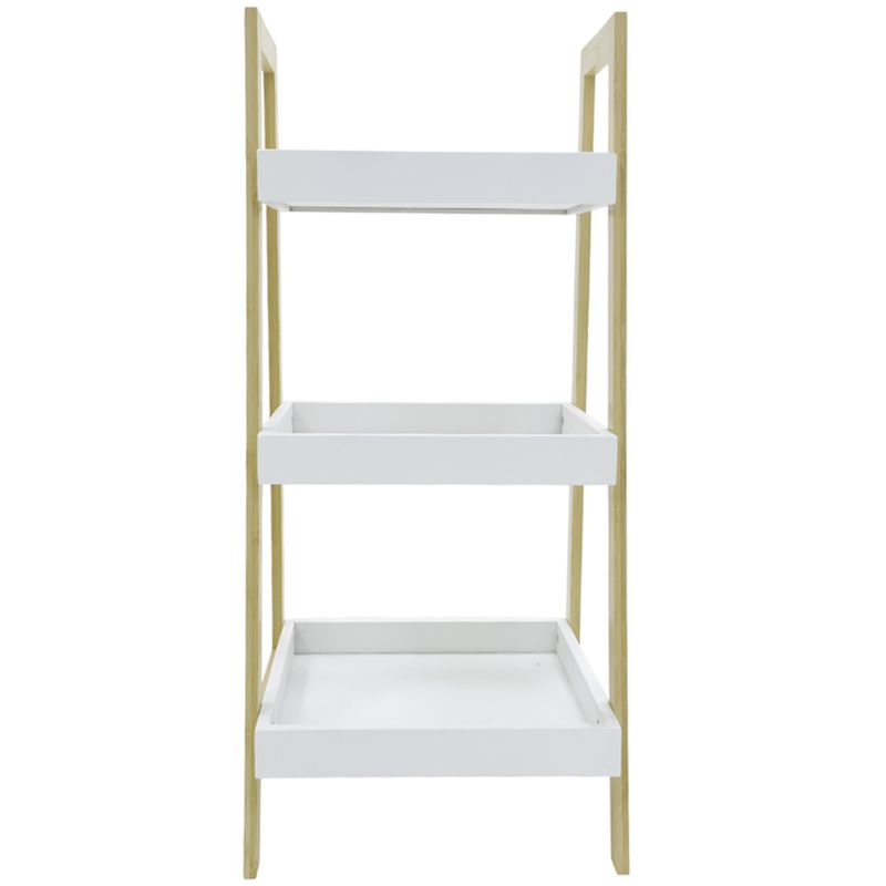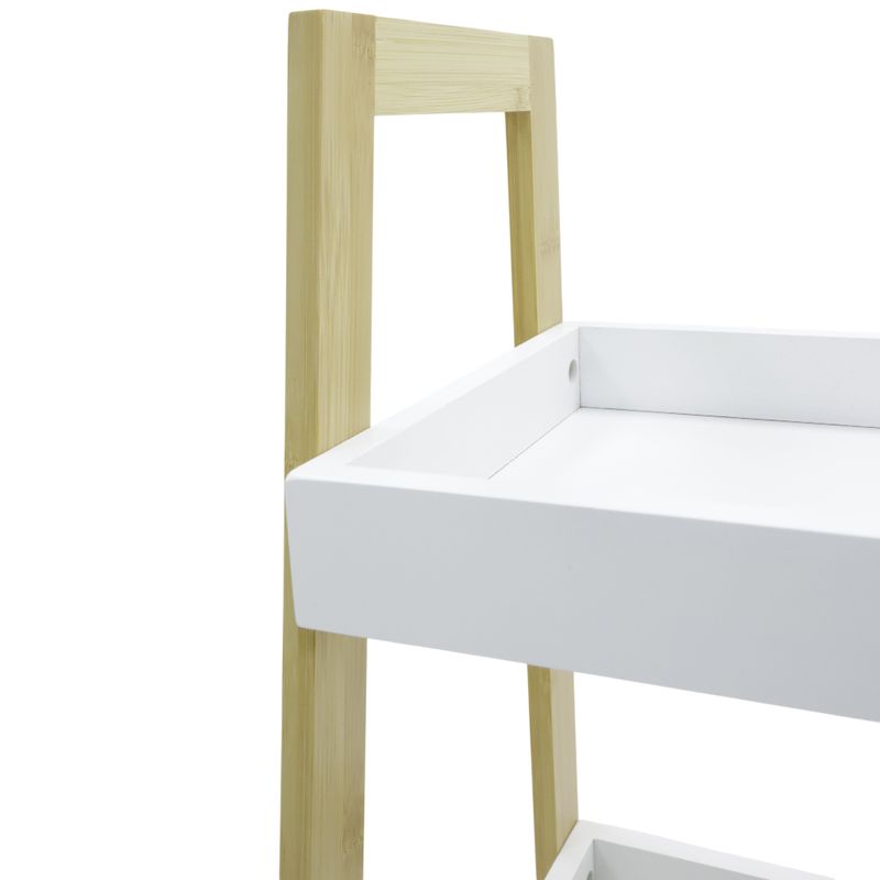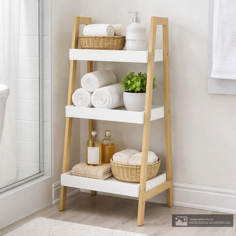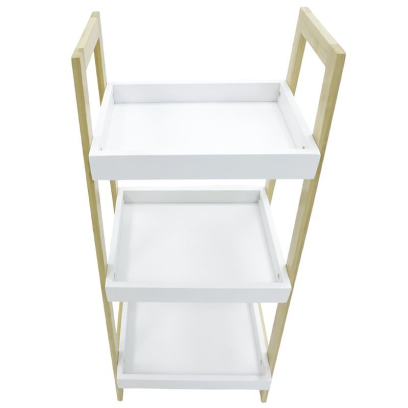 Estante organizador de tres niveles con estructura en madera clara y bandejas superiores blancas. Ideal para baño, cocina o áreas de servicio gracias a su diseño ligero y fácil de mover.