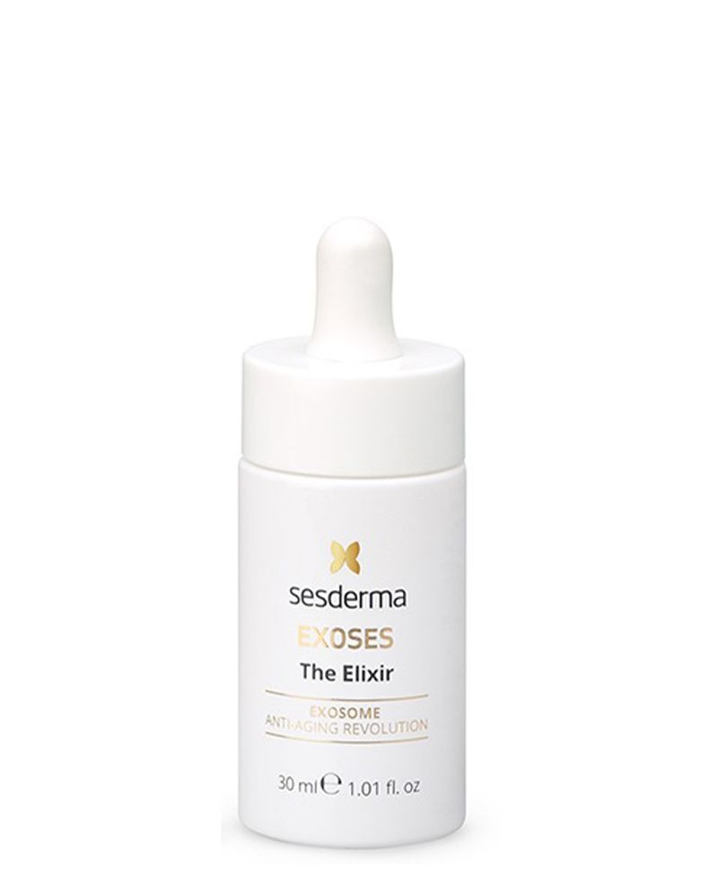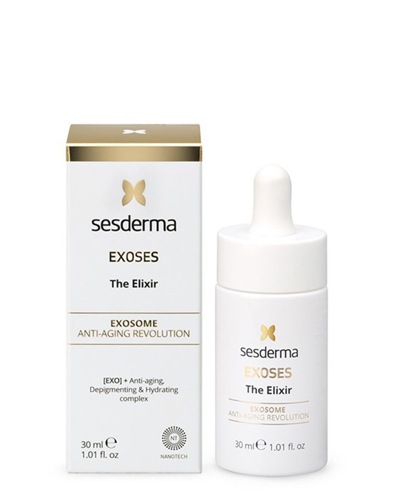 EXOSES de Sesderma, es un avanzado sistema antiedad que fusiona exosomas con un potente cóctel revitalizante compuesto por diferentes activos como: niacinamida, silicio orgánico, arbutina, centella asiática, ácido hialurónico, HPR, entre otros.