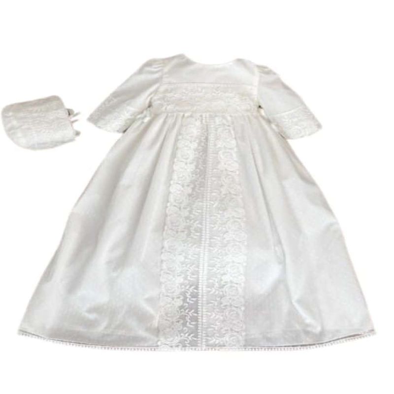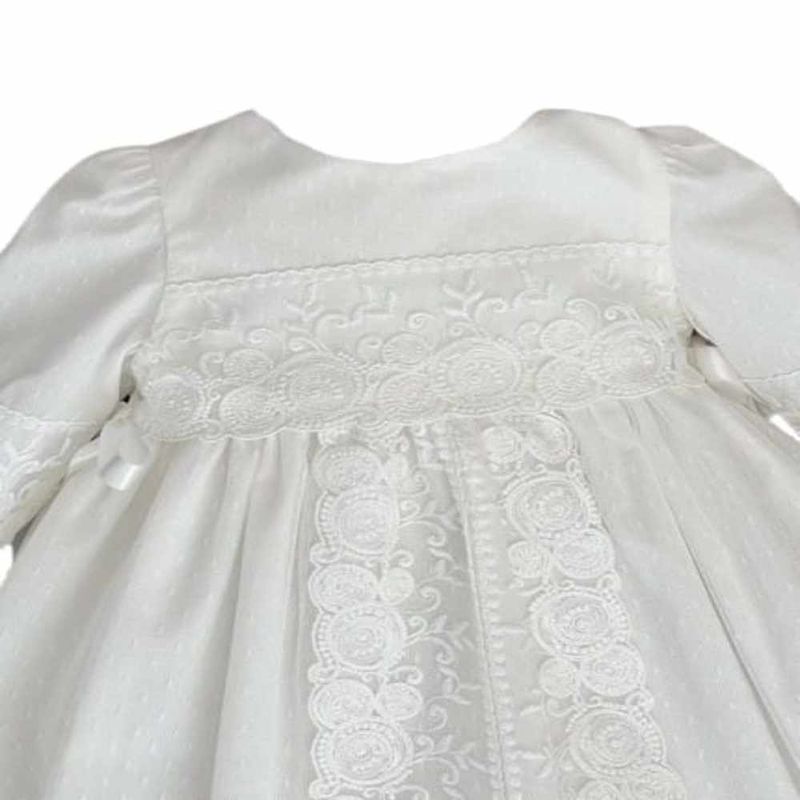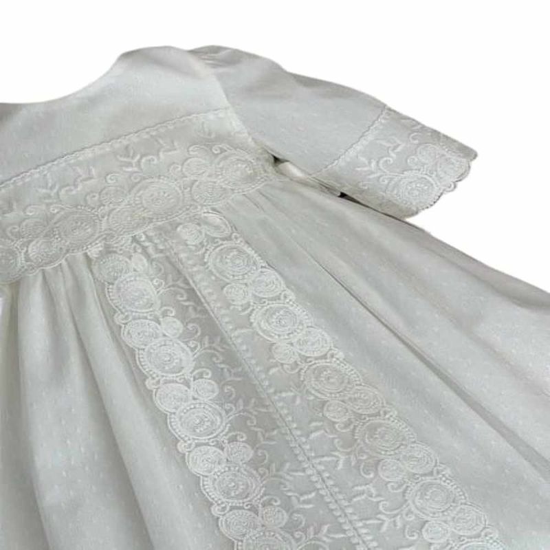 Este elegante faldón de bautizo es una prenda tradicional y delicada, perfecta para un día tan especial. Confeccionado en fino tul, presenta un diseño encantador con cuello redondo y manga francesa corta, ideal para aportar un toque de distinción. Los detalles en puntilla Chantilly realzan su estilo clásico y sofisticado, haciendo de este faldón una elección inolvidable para celebrar el bautizo con ternura y elegancia.