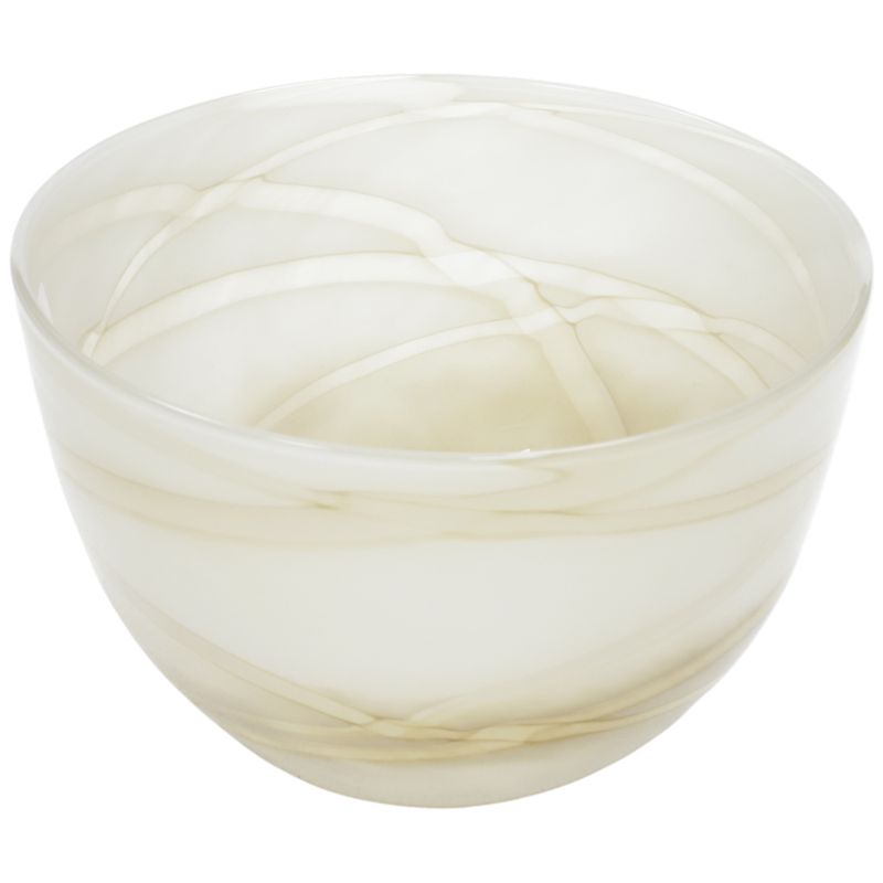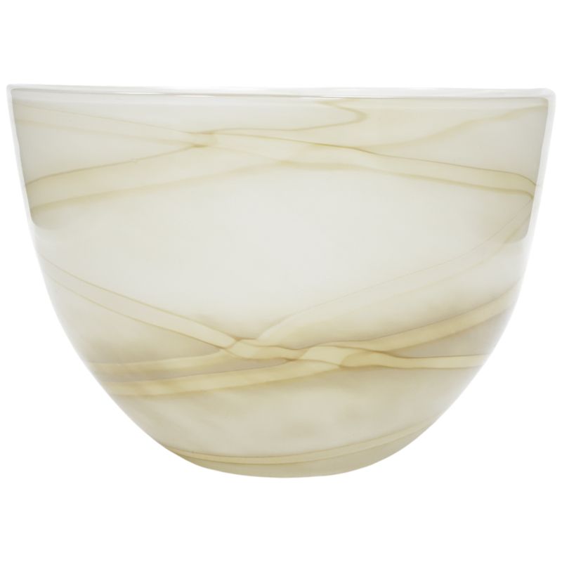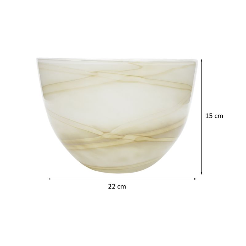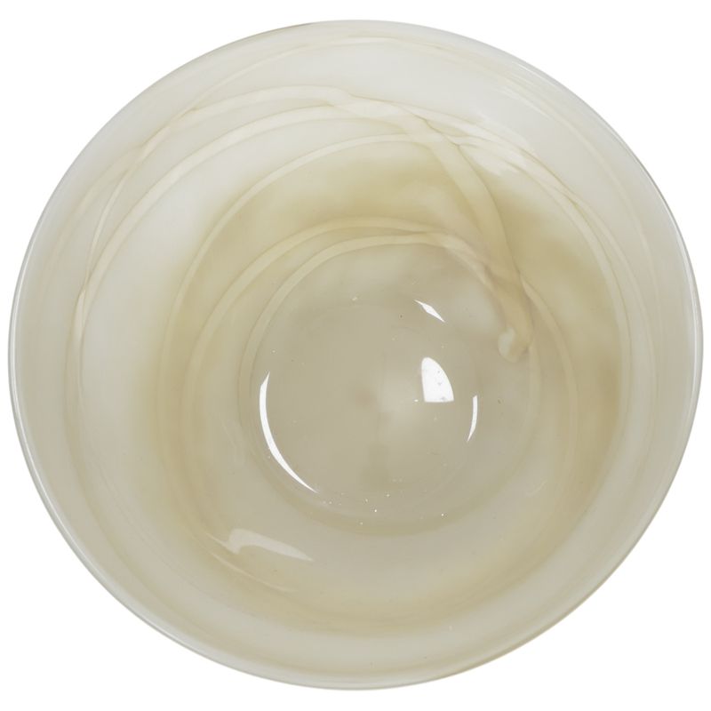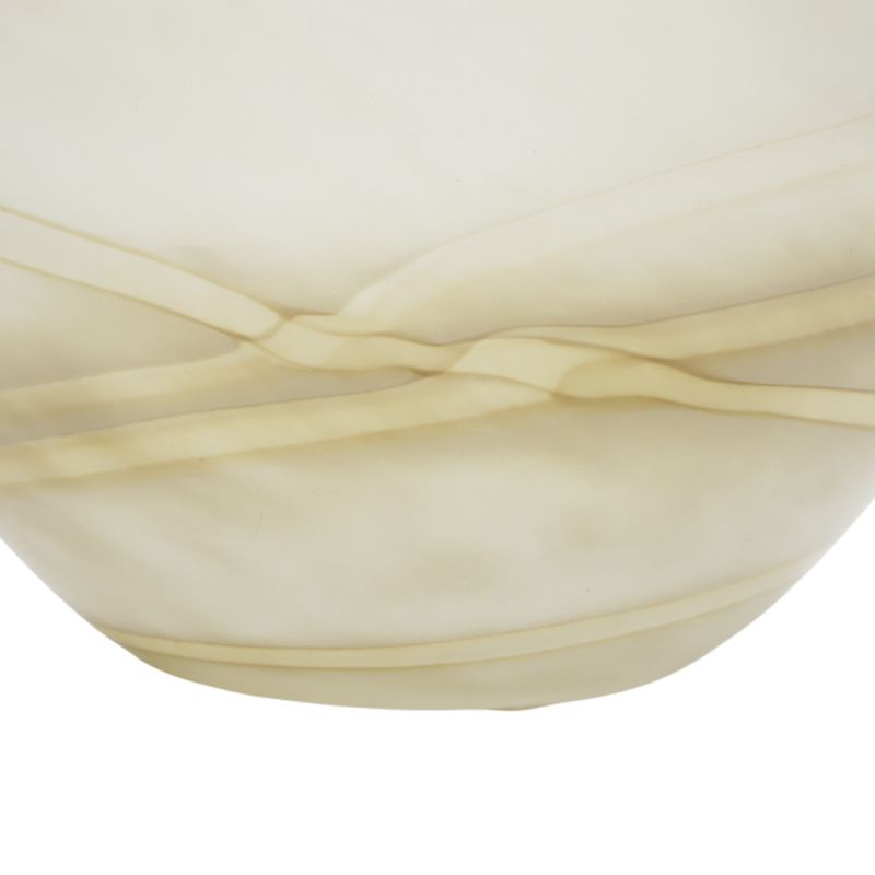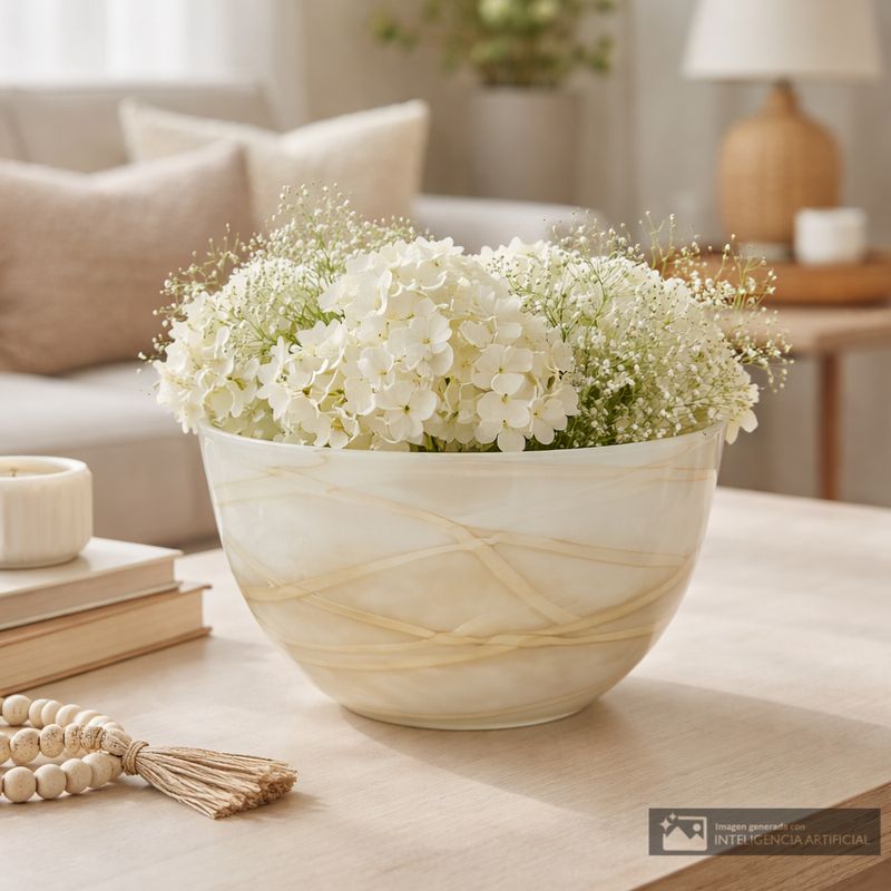 Florero de vidrio con diseño marmoleado en tonos suaves. Su tamaño compacto lo hace adecuado para mesas pequeñas, repisas o arreglos florales minimalistas.