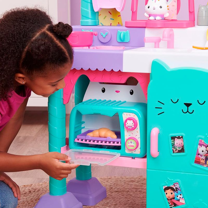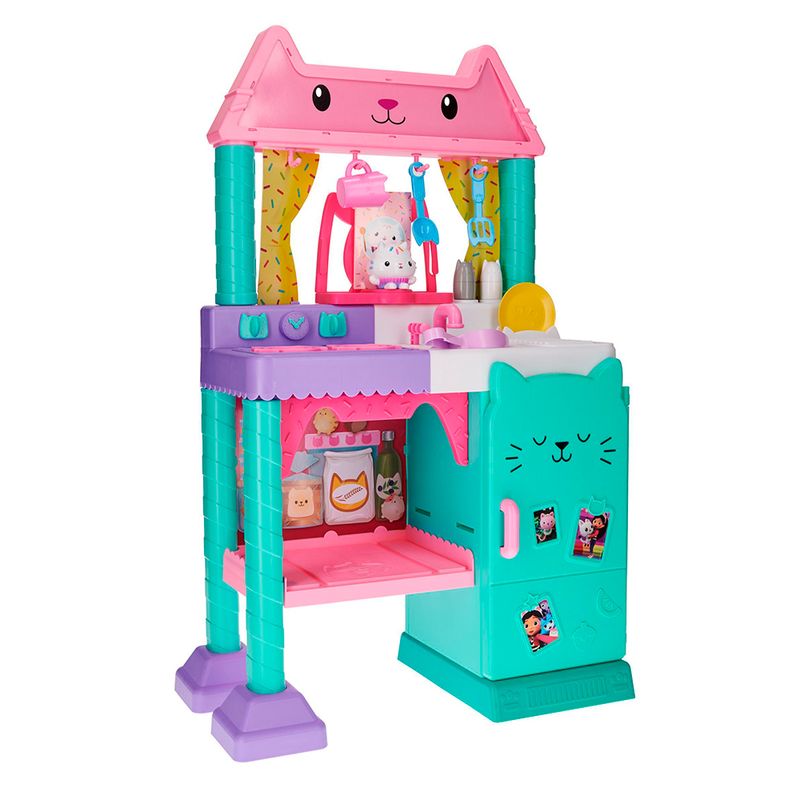 Presentamos el juego de cocina Gabby's Dollhouse, Cakey Cat para niños. Esta cocina de juego es una maravillosa adición a la línea de juguetes de juego de simulación de Gabbys para niñas y niños, que viene con más de 20 accesorios de cocina y mide más de 3 pies de alto. La cocina de juguete de Cakey cuenta con una estufa, un fregadero con un escurridor de platos, 10 accesorios y utensilios de cocina, con ganchos para utensilios que cuelgan por encima de la ventana, junto con 9 piezas de comida de juego y un refrigerador de juguete que tiene fotos de Gabby y sus gatitos Cat-Tastic, que también se pueden utilizar para almacenar tu comida de juego, accesorios de cocina y piezas de juego de cocina de tus hijos. Este hermoso juguete de cocina también cuenta con una gran figura de Cakey Cat, con un soporte especial que se fija al alféizar de la ventana, para que Cakey pueda verte crear tus obras maestras de comida de juguete. Presiona el botón en el soporte de Cakey y gira las perillas de la estufa, para activar más de 20 sonidos y frases, y disfrutar de 9 efectos de sonido de cocción, 3 números musicales y 11 frases de Cakey Cat que conocen de la exitosa serie de Netflix, Gabby's Dollhouse! Para hacer crecer aún más tu pequeño juego de cocina de casa, también hay un estante que se encuentra justo debajo de la estufa, que ha sido especialmente diseñado para sostener la diversión y emocionante Bakey with Cakey Oven (se vende por separado). El juego de cocina para niños Cakey Cat es imprescindible para cualquier fanático del espectáculo de Gabby's Dollhouse y sería una fantástica adición a cualquier casa de juegos para niños, para que los niños puedan recrear escenas de sus programas de cocina favoritos y crear sus propias creaciones de cocina para familiares y amigos.