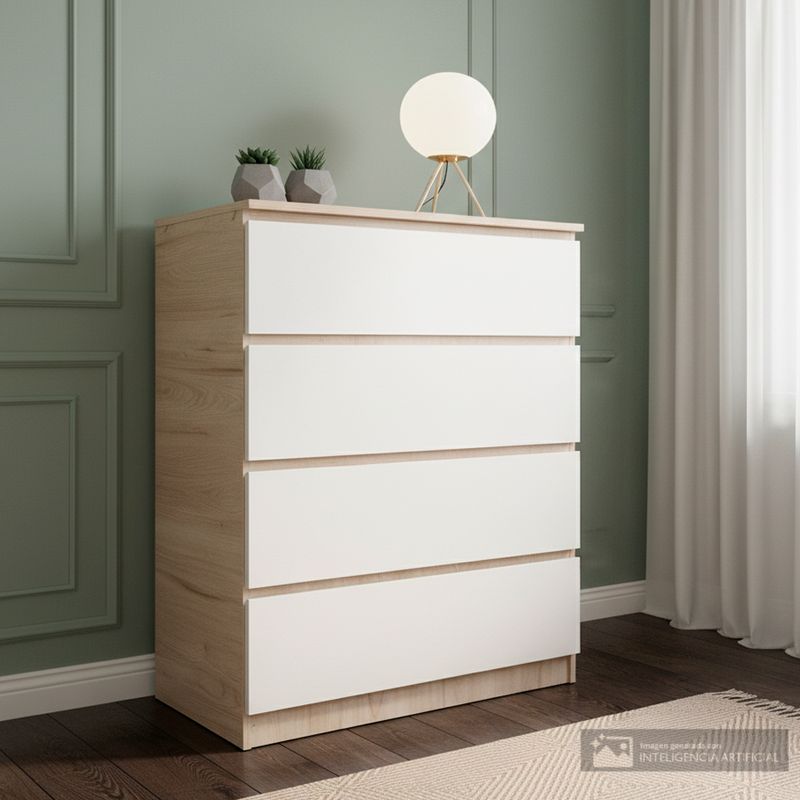 Diseño minimalista y funcionalidad elegante Un mueble que destaca por su simplicidad y eficiencia. El Gavetero Canicia cuenta con 4 gavetas amplias, fabricado en melamina chilena de alta calidad y fondo en MDF. Su diseño en blanco con acabado tipo madera y rieles telescópicos en cada gaveta lo hacen ideal para espacios modernos y organizados.