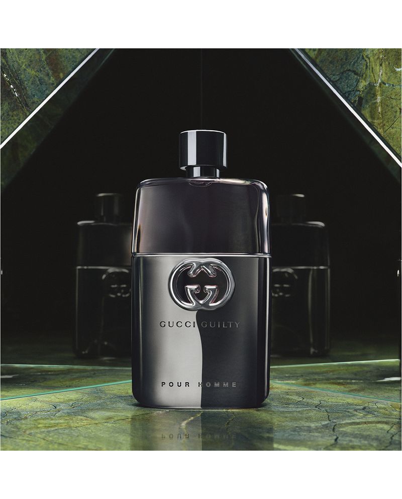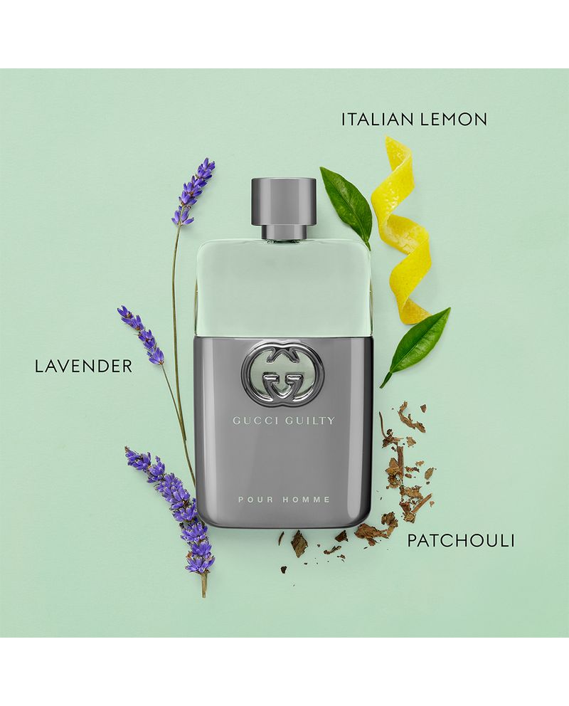 Rompiendo las reglas de la elaboración tradicional de fragancias masculinas, Gucci Guilty Pour Homme Eau de Toilette para hombre se abre con notas de salida de limón italiano chispeante y lavanda francesa, antes de vibrar suavemente en un corazón de flor de naranja y matices de base con infusión de pachulí.