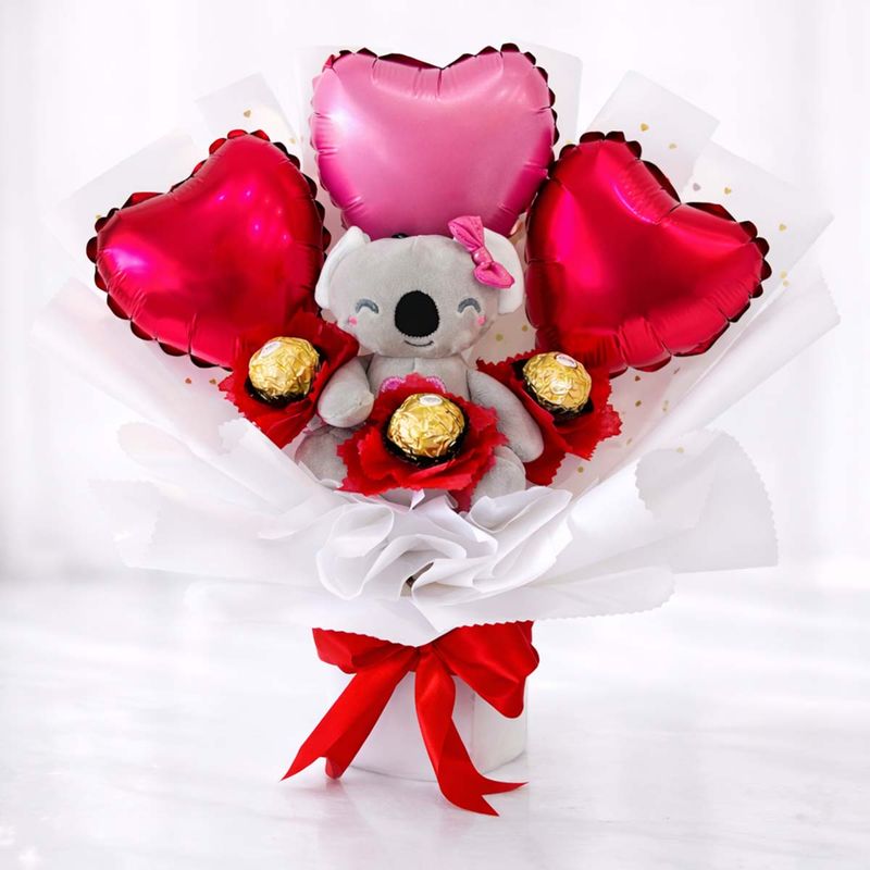 Balloon bouquet con peluche y chocolates ferrero rocher