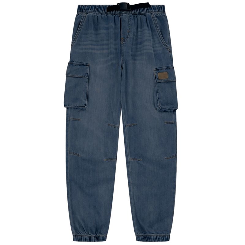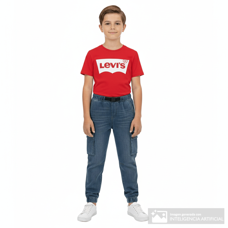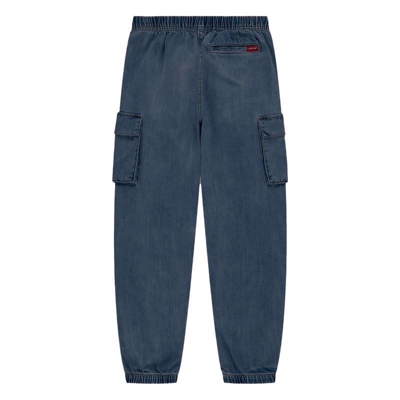 Jogger cargo Levi’s para niño en mezclilla azul de lavado medio, con estilo urbano y moderno. Cintura elástica con ajuste cómodo que facilita el calce y brinda soporte, diseño tipo cargo con bolsillos laterales de tapa para mayor funcionalidad. Puños elásticos en tobillos que aportan look jogger y libertad de movimiento. Ideal para uso diario, combina con camisetas o sudaderas para un outfit casual.